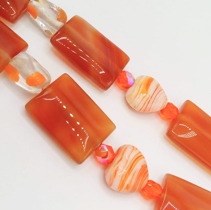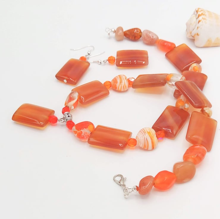 Orange Rectangular Beads and Hearts Necklace with Rectangle Pendant and Earrings, Orange Jewellery Set, Necklace and Earrings Set, Birthday Gift, Anniversary Gift, Christmas Gift, Stocking Filler, Gift for Her, Gift Ideas for Women