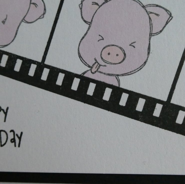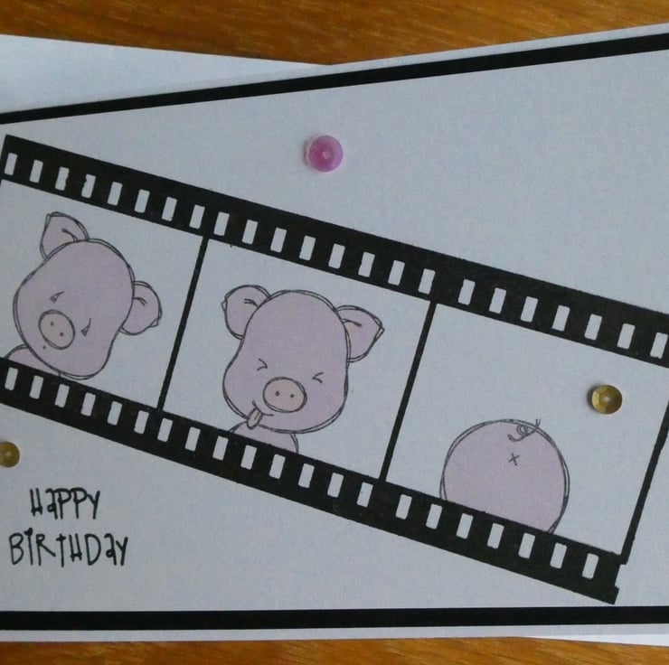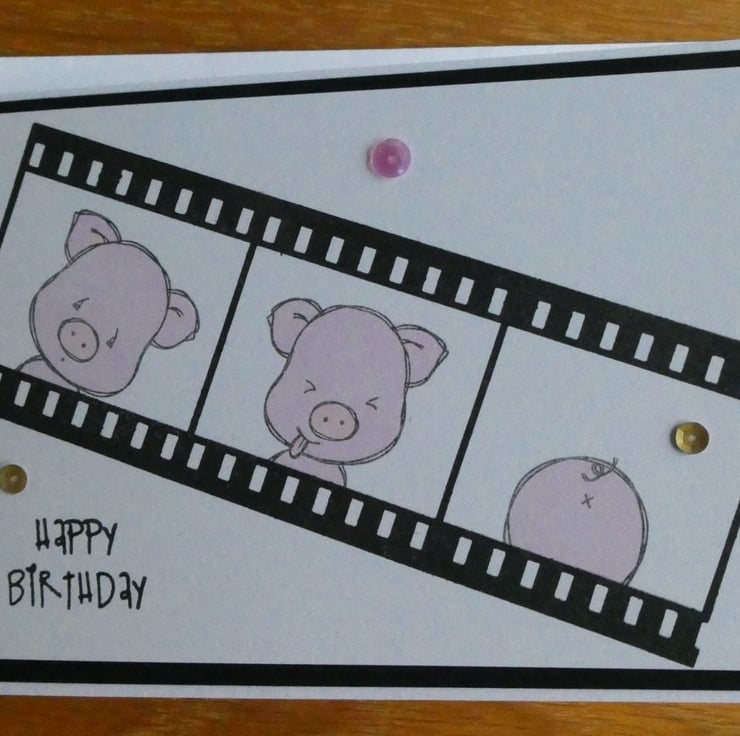 This cute and cheeky birthday card has a film strip design with a series of pictures of a pig having fun posing. The design has been finished with pink and gold sequins.