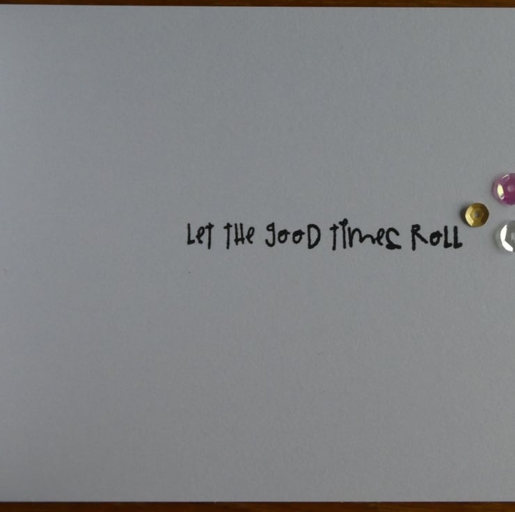 Inside the card is the hand stamped message 'let the good times roll' and more sequins.