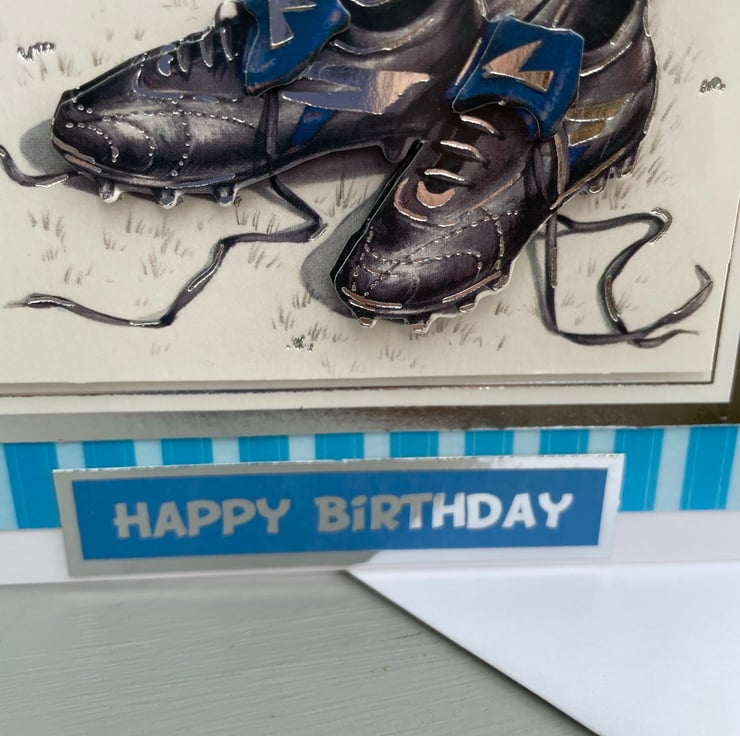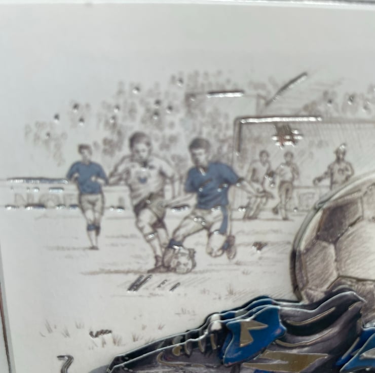 Perfect for the footy fan in your life. A one for the blues supporters out there, whoever that is! A 15x15cm square card features a blue striped paper. The main feature is a layered design with a football, a pair of football boots and a match in the background. A strip of silver embossed card with footballers on goes across the card. The greeting is Happy birthday. The inside is blank for your own greeting.
