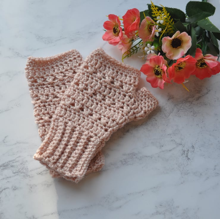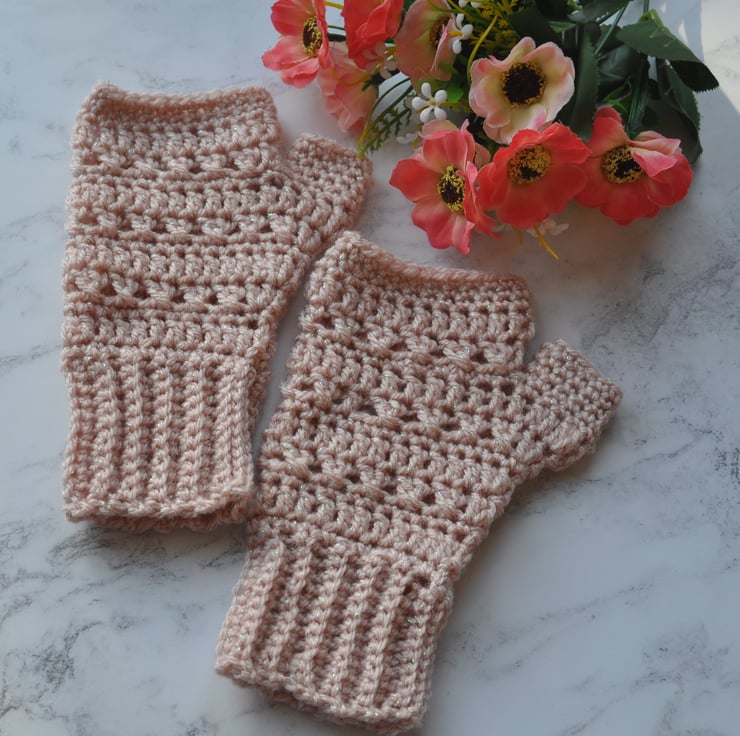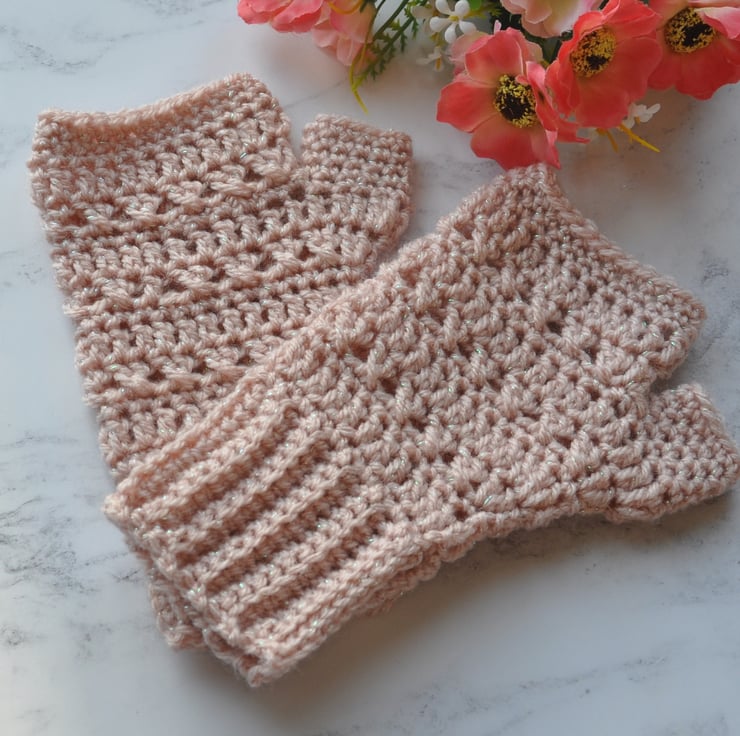 I have hand crocheted these gorgeous finger less gloves to fit girls and ladies in a luxury soft dusky rose coloured yarn with sparkles using my very pretty pattern. They have a really pretty shimmer to them which is difficult to show in the photographs. The cuffs are a really good length to keep your wrists warm too.