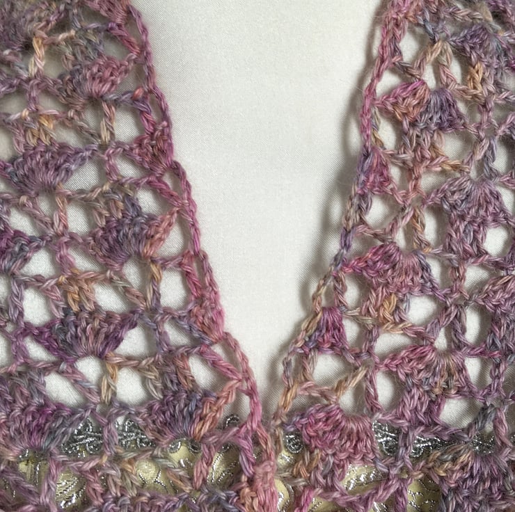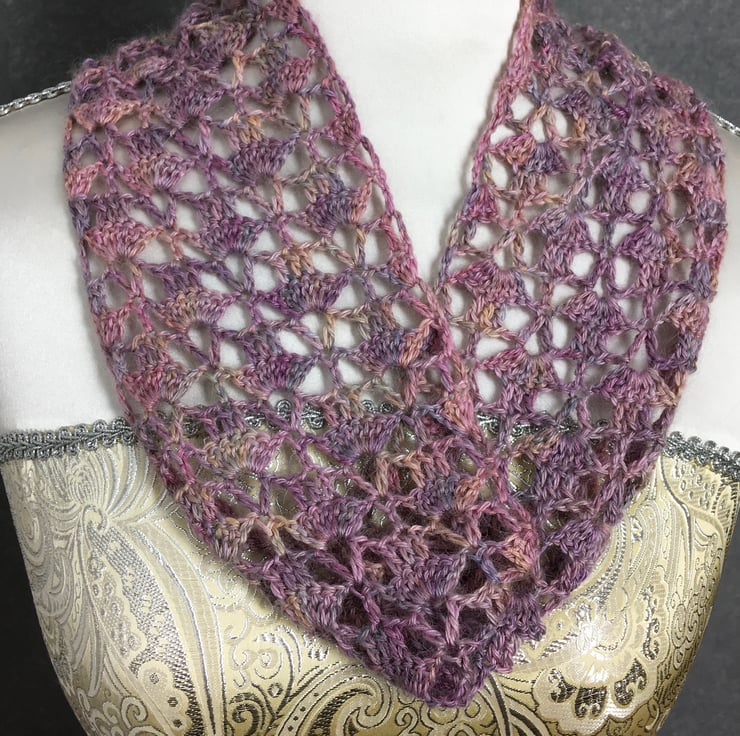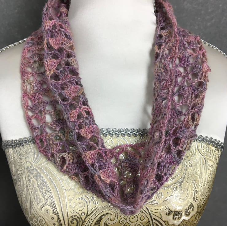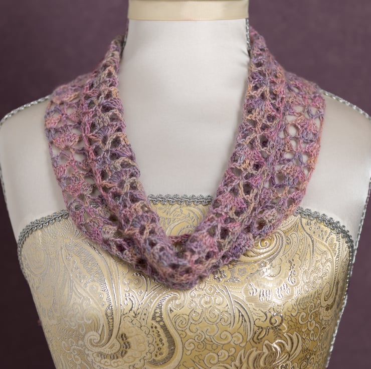 Ladies soft and pretty cowl scarf hand crocheted in baby alpaca and silk blend yarn. This is a delicate and feminine accessory which is luxuriously soft, with a slightly fluffy feel. The colour of this pretty pastel hand dyed yarn is a subtle mix of faded pink, purple, peach and blue. This cowl would be a charming accessory for a jumper or blouse, and really dresses up crew neck tops.