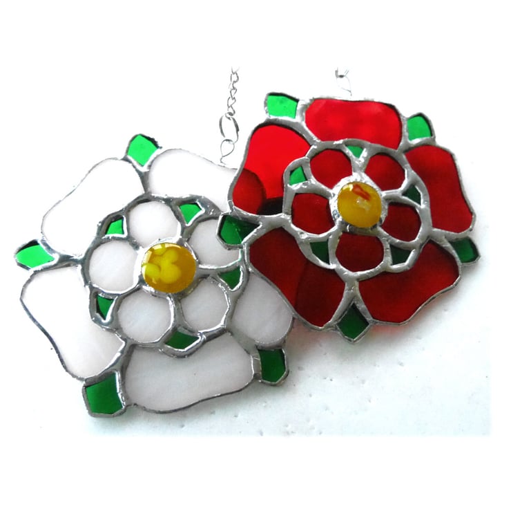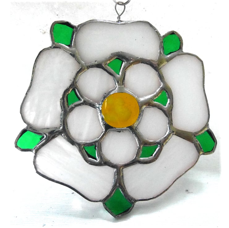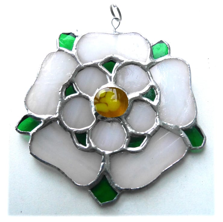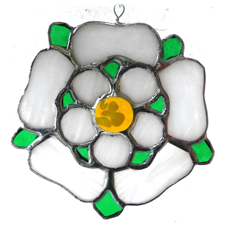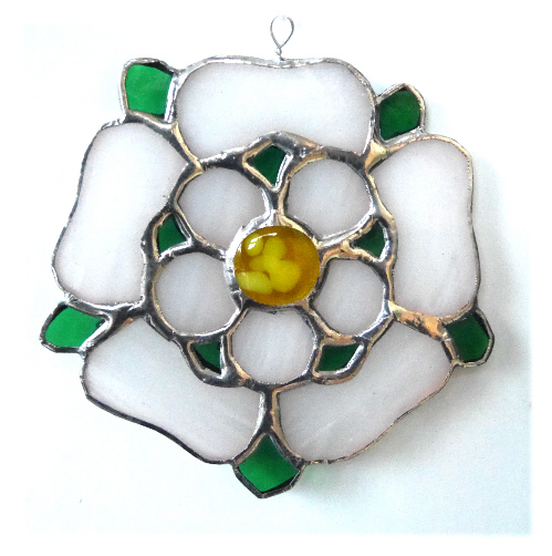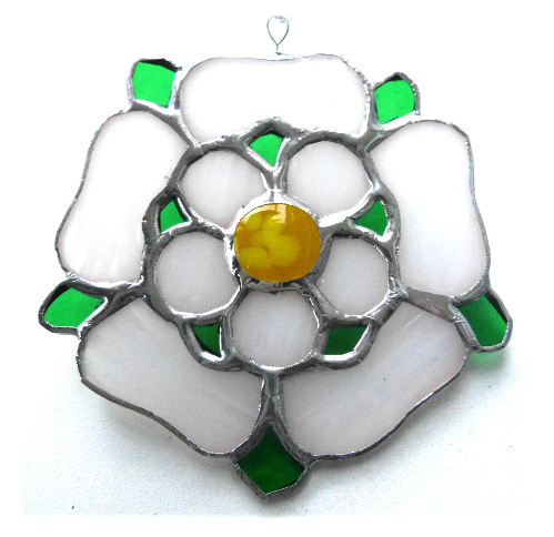 The rose is the classic Yorkshire / Lancashire design with two rings of 5 white glass petals and 2 rings of little green leaves