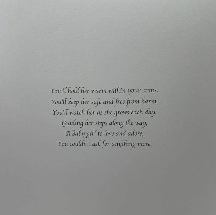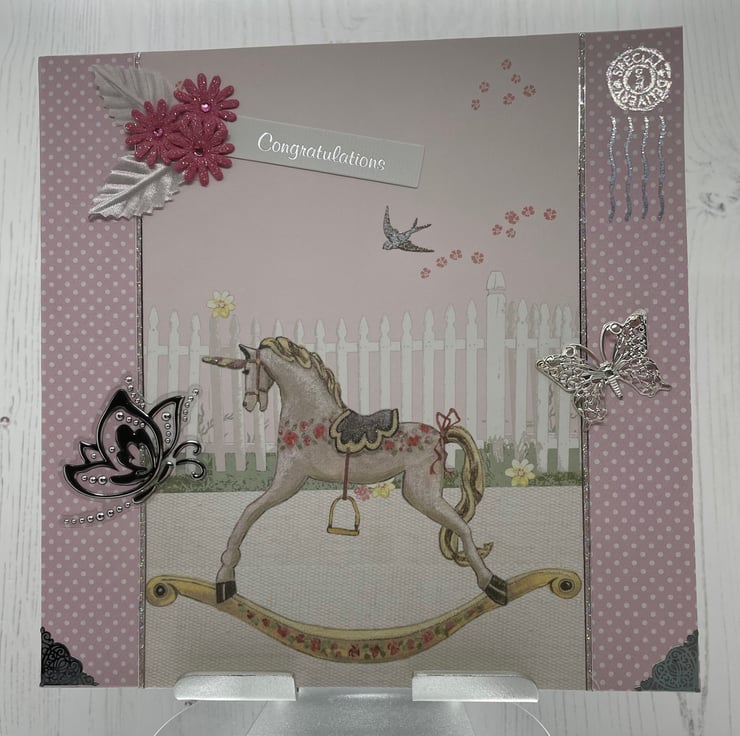 Delicate shades of pink backing paper. Pink with white polka dots down the sides. Garden scene with a white picket fence, blue bird, flowers and butterflies with a vintage rocking horse image. Special Delivery stamp on the top right. Silver foiled Congratulations banner with pink daisies and white silk leaves. Silver butterfly charm on the right.