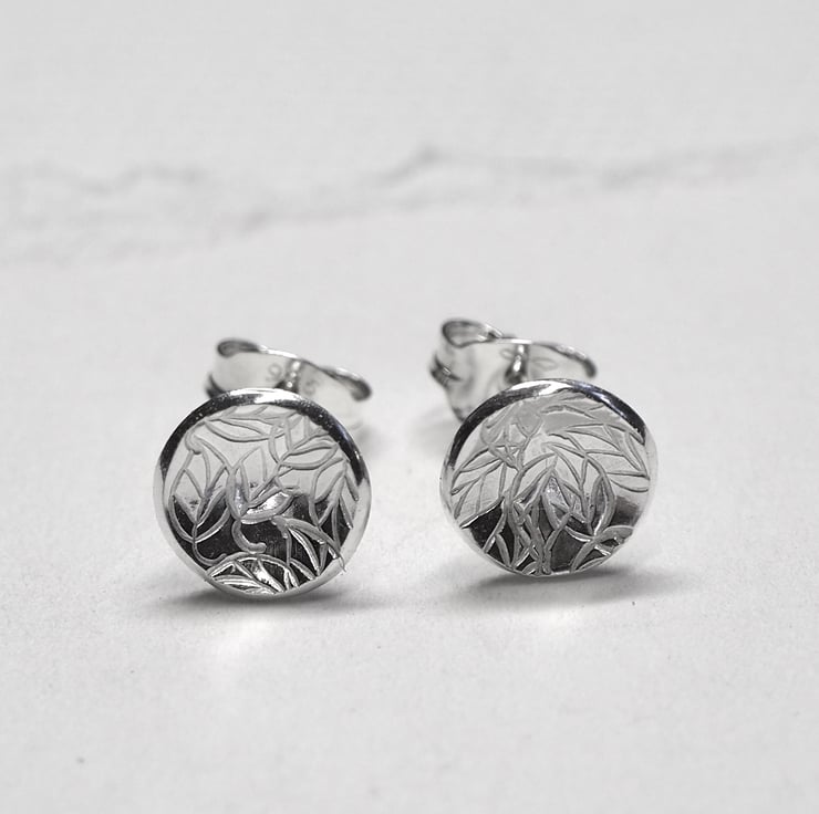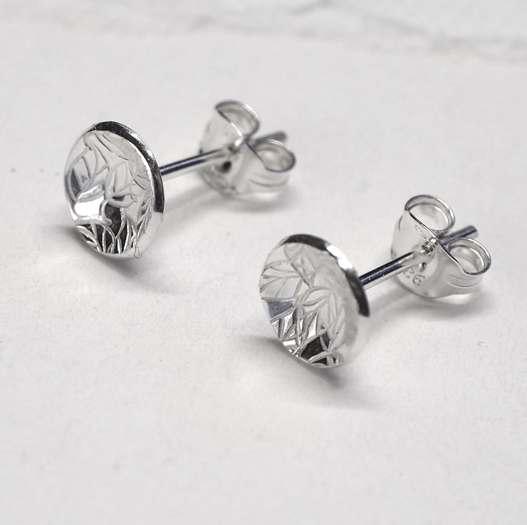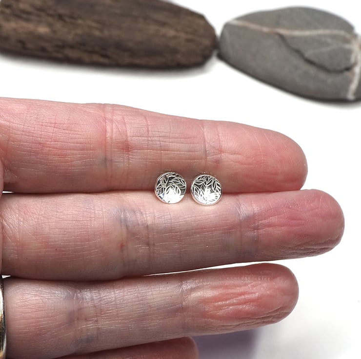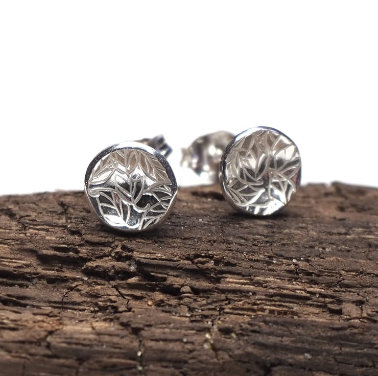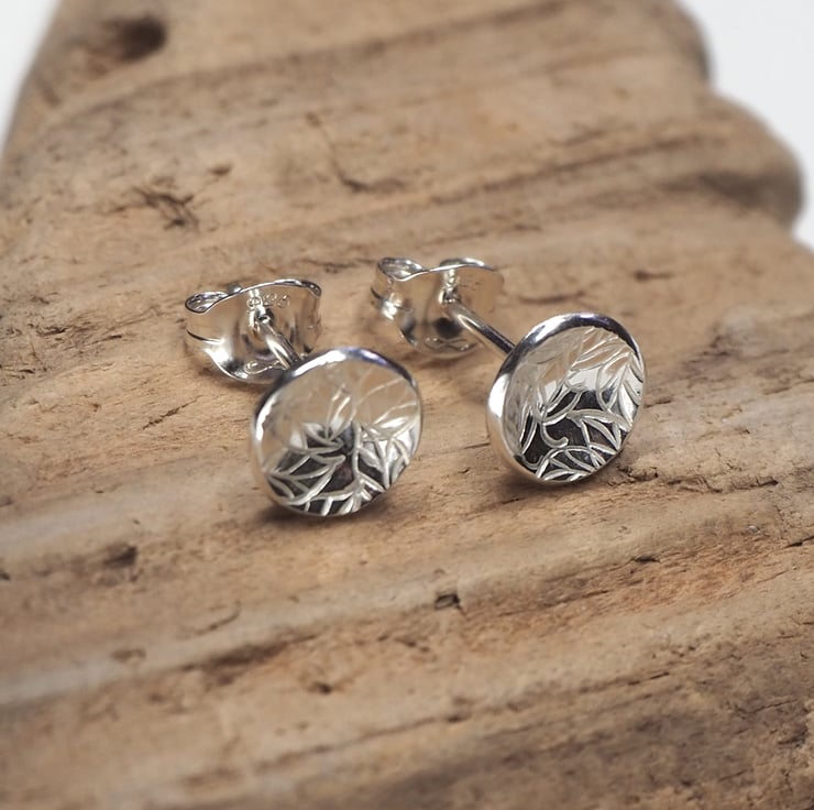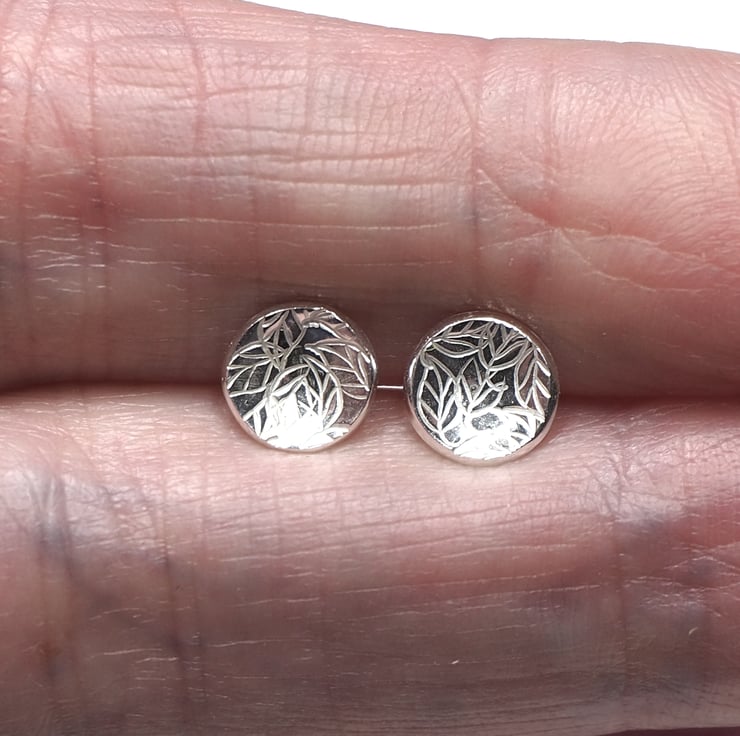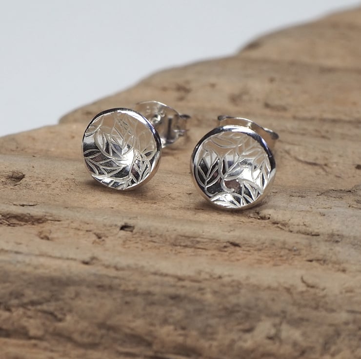 A leaf design has been punched into discs of sterling silver to give a pretty abstract surface pattern to these stud earrings. The discs have been domed to create a lovely bowl shape and burnished to a bright shine.
