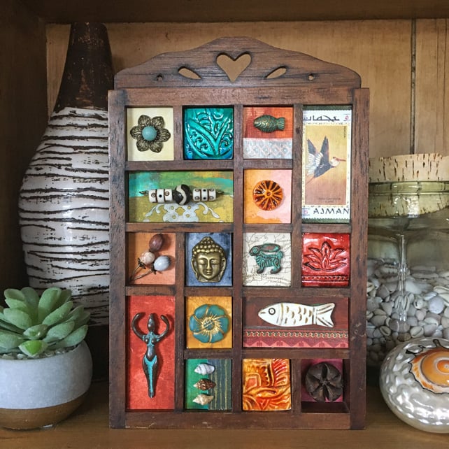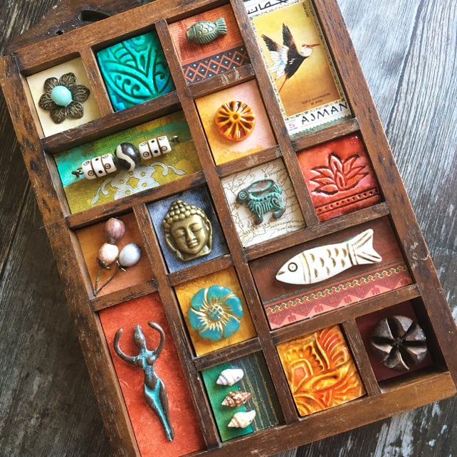 The artwork is displayed in a pretty wooden vintage thimble rack. Internal sections have been given a background of acrylic paint with decorative papers from old books added to some compartments.