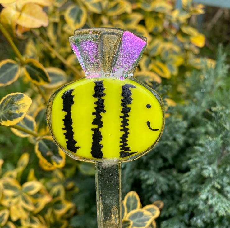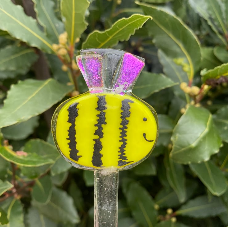 One fused Glass Bee plant pot or garden stake decoration with sparkly rainbow dichroic wings .