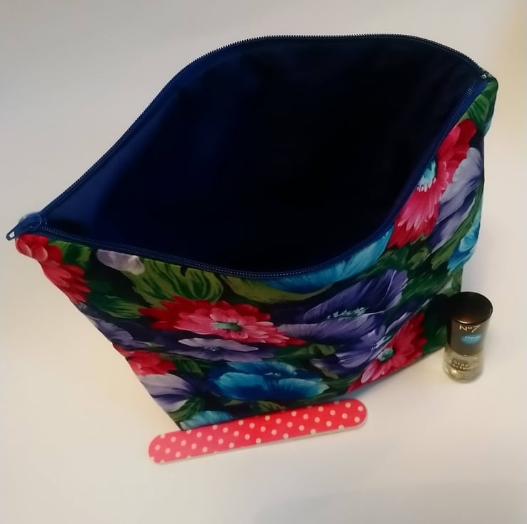 This is a make up bag made from a fabric featuring purple, pink and blue flowers and has been lined in a dark blue fabric