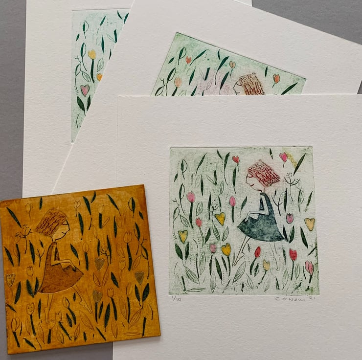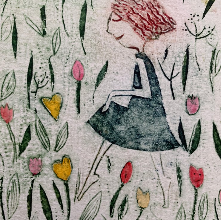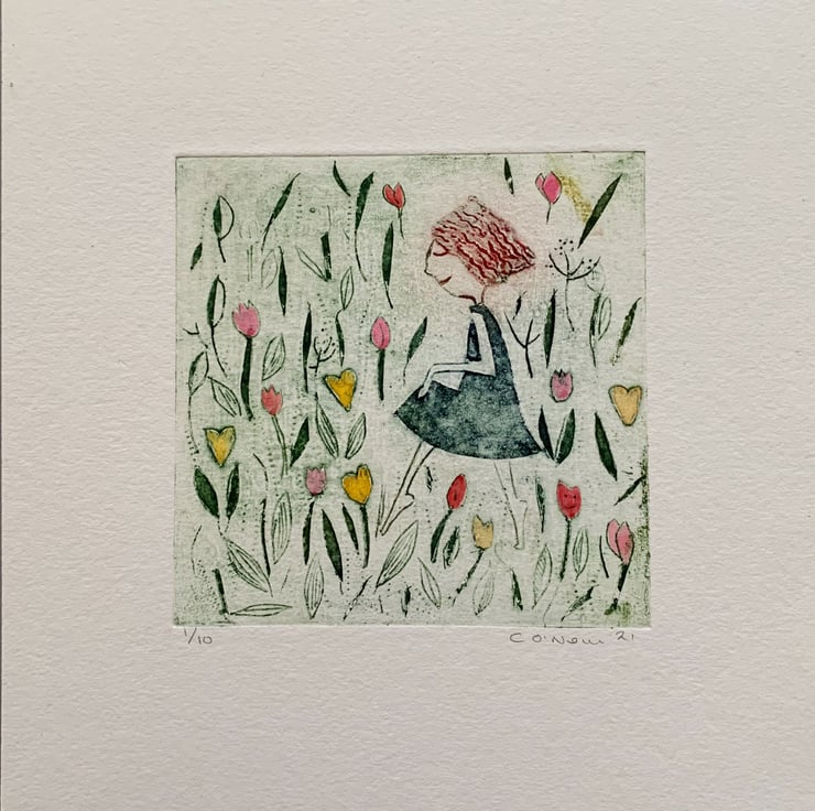 Tiptoe is Garden is a illustrative Collagraph print. Collagraph printing is a handmade process so no print will be exactly the same. This process produces very soft colours which merge into one another. I have added a touch of water colour to the flowers to give extra definition.