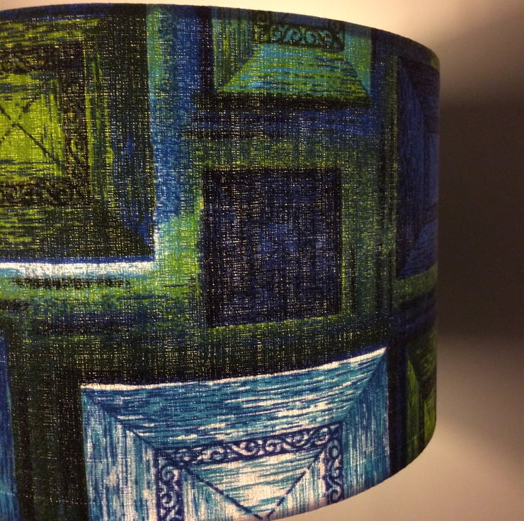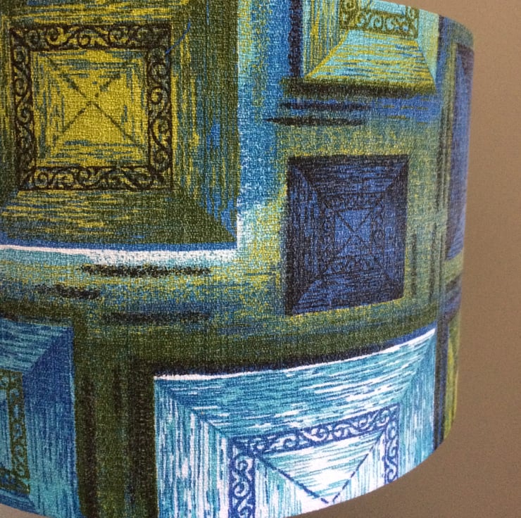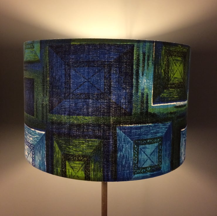 Smart Geometric Square Blue Green 50s 60s Mid Century Barkcloth Vintage Fabric Lampshade - a smart fabric for a lampshade in a modern or mid century styled home.