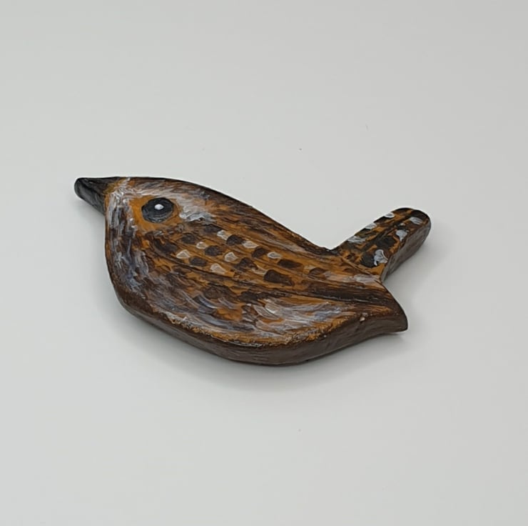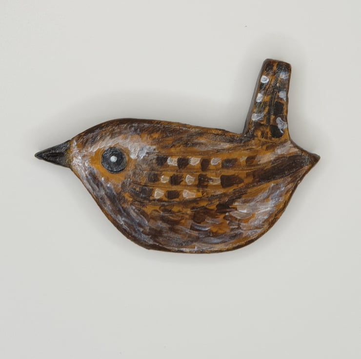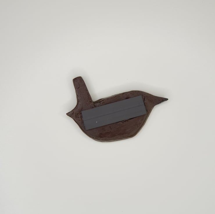 Little Jenny wren lovingly handcrafted from air dry clay, painted with acrylics and sealed with varnish. A strong magnet has then been added to the back. This gorgeous wren would make a great addition to your kitchen fridge or can be attached to any surface with magnetic properties.