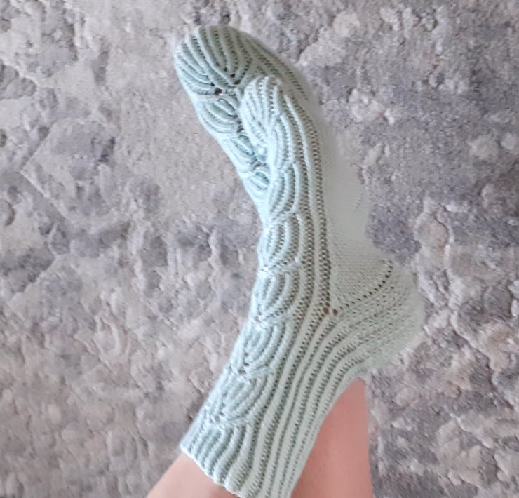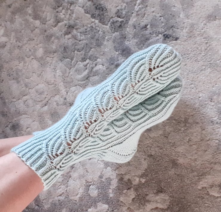 These openwork pattern socks are knitted using 5 knitting needles.