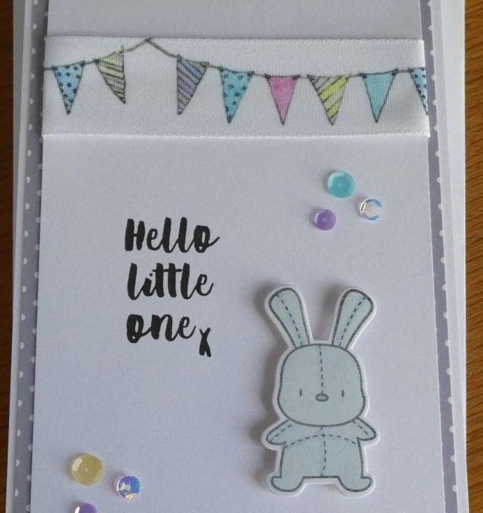 This New Baby card has been hand stamped with the message 'Hello little one x' .