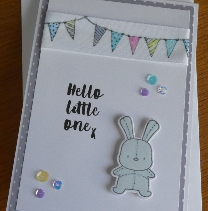 The card has a ribbon across the top printed with bunting in pastel colours and a hand stamped and coloured blue bunny at the bottom. The bunny has been raised from the card with foam pads to give dimension.
