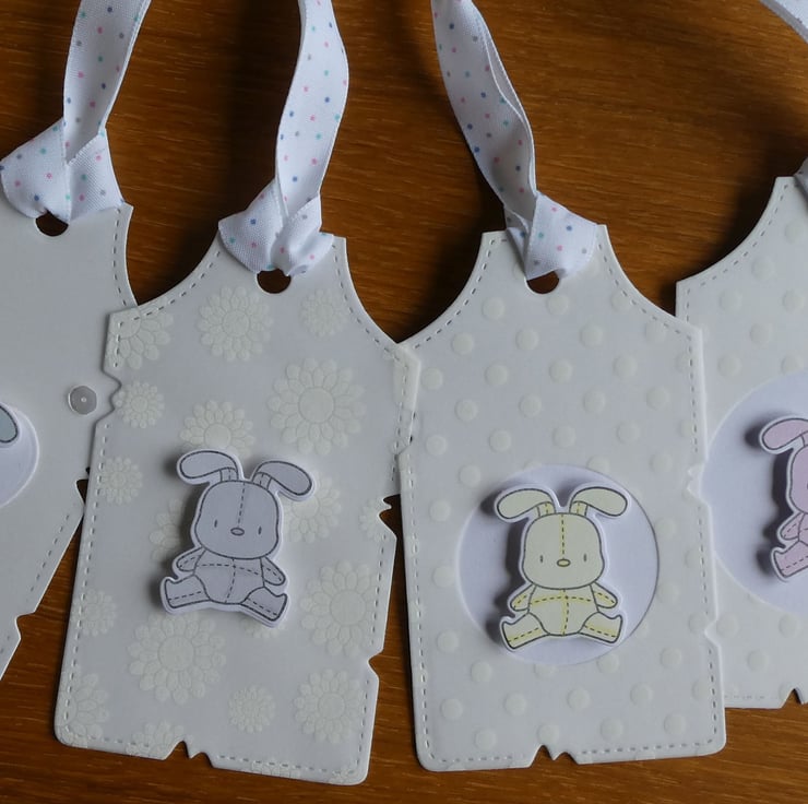 A randomly chosen free gift tag will be included with your card from the selection shown. The tags all have layers of white card and vellum and a hand stamped and coloured bunny in the same colour as the card. The tag is finished with a white and pastel dotty ribbon.