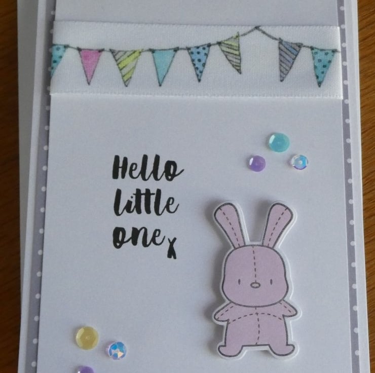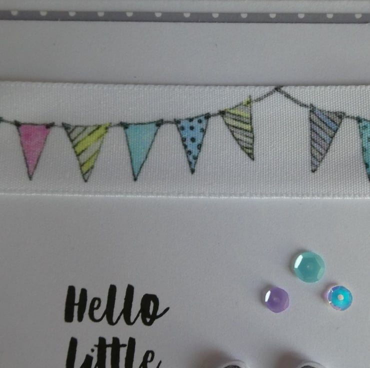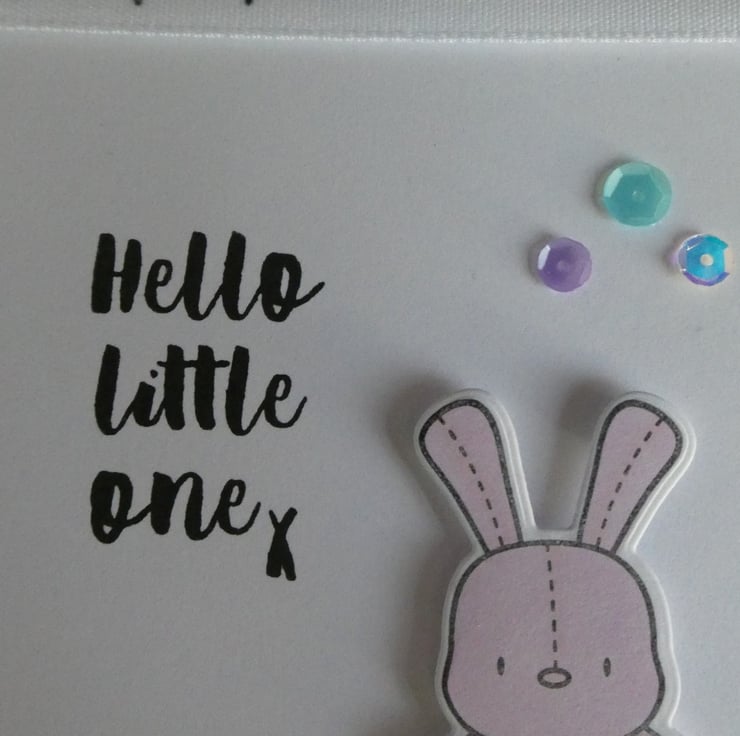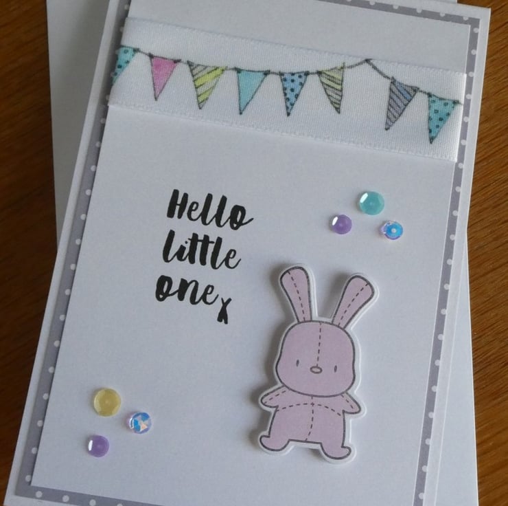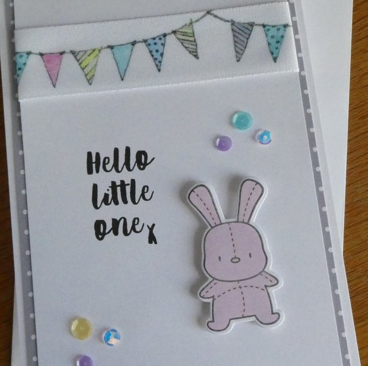 This New Baby card has been hand stamped with the message 'Hello little one x' and now comes with a free coordinating gift tag.
