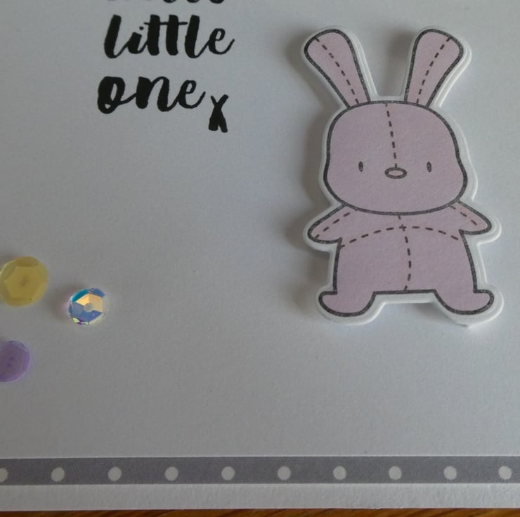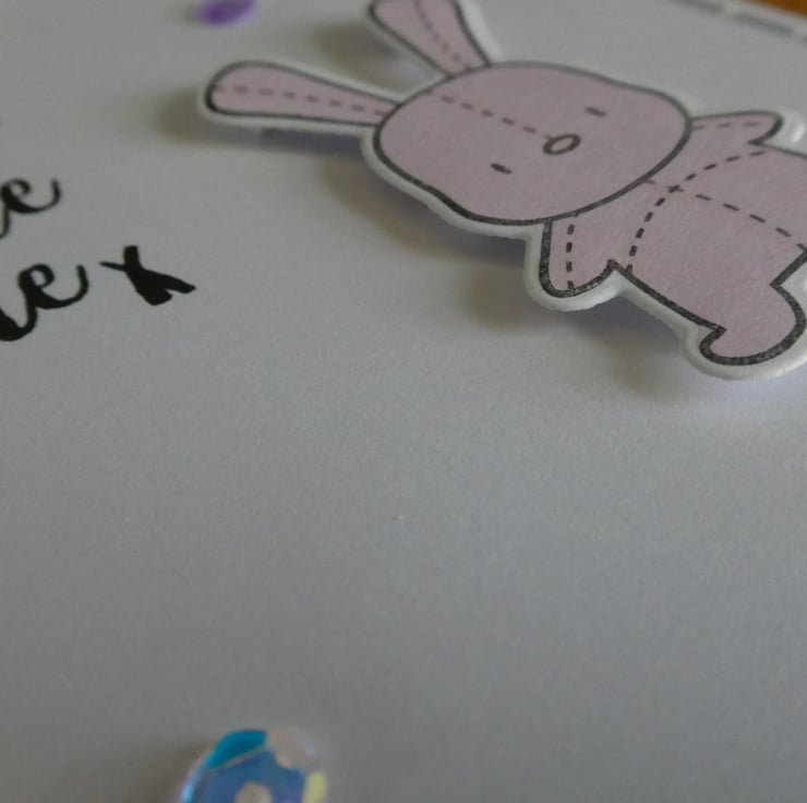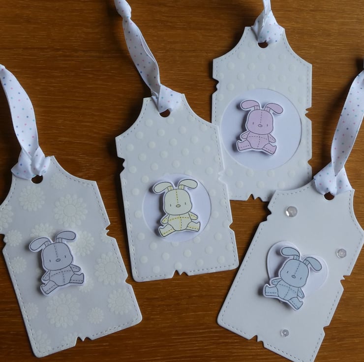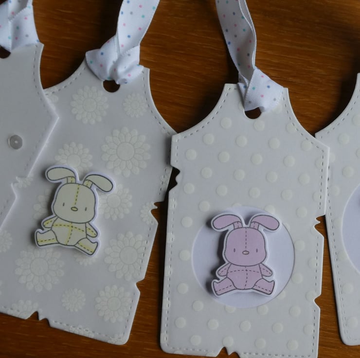 A randomly chosen free gift tag will be included with your card from the selection shown. The tags all have layers of white card and vellum and a hand stamped and coloured bunny in the same colour as the card. The tag is finished with a white and pastel dotty ribbon.