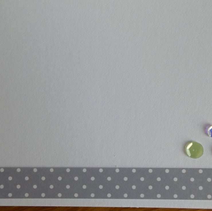 The design has been finished with a mixture of pastel and iridescent sequins and then mounted onto a layer of grey and white polka dot card to give it a frame.