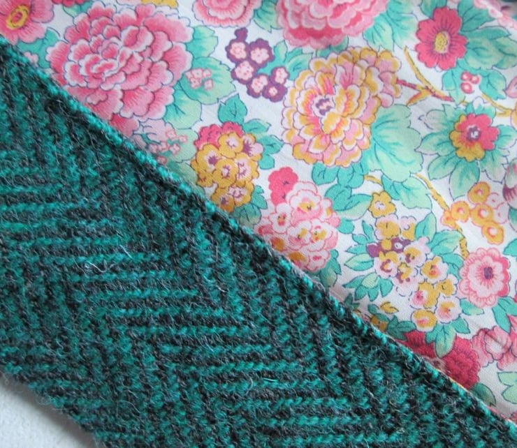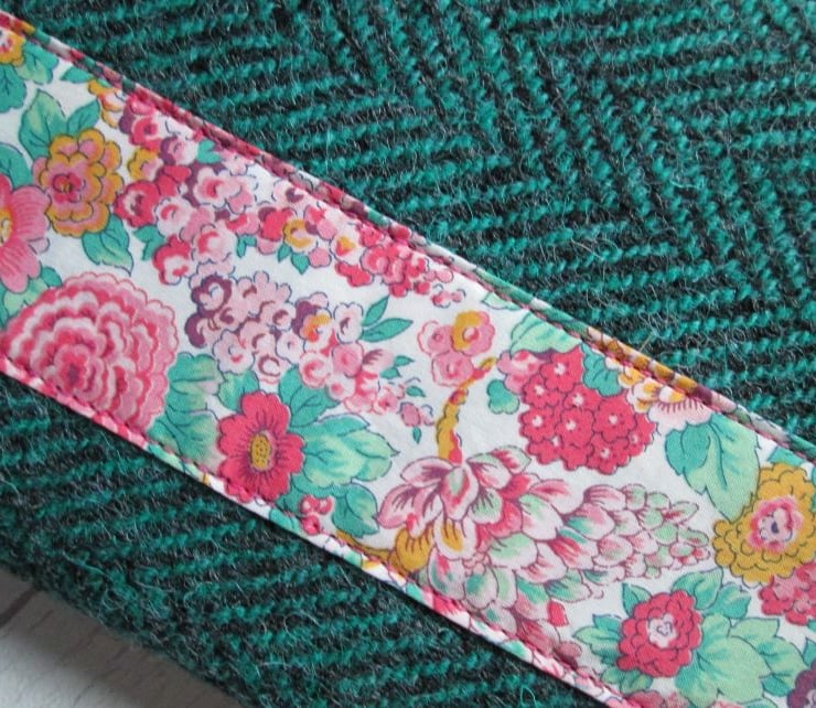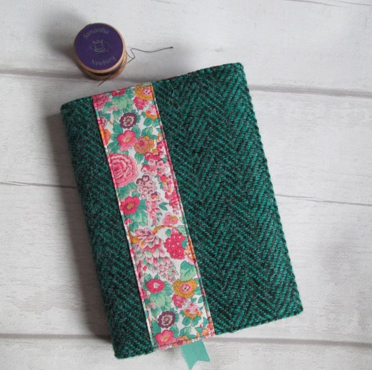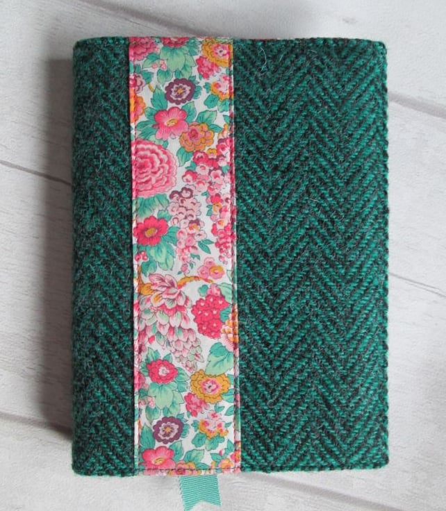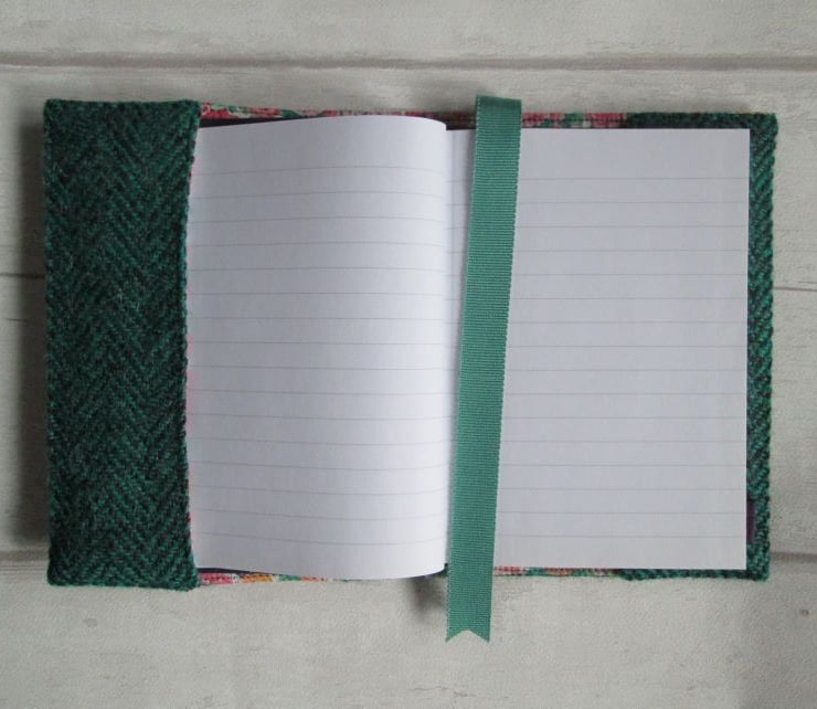 Two classic British fabrics in one vibrant notebook cover - handwoven 'Harris Tweed' in a beautiful dark jade green herringbone, teamed with a vintage style Liberty London floral print lining and feature band that picks up the green of the 'Harris Tweed' perfectly.