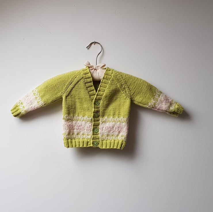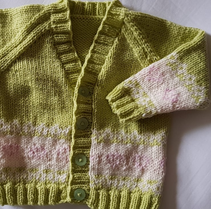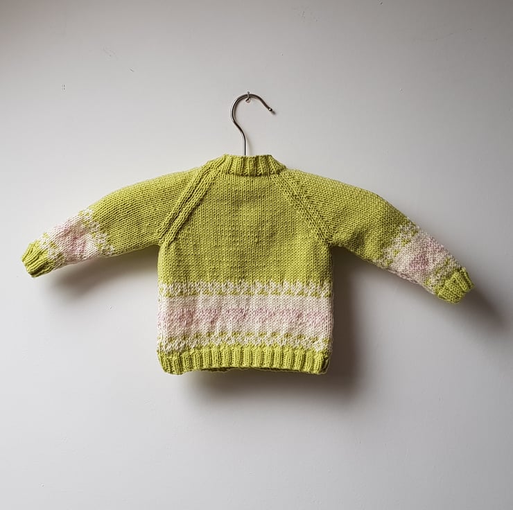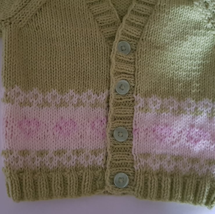 This very pretty cardigan has been hand knitted in green baby yarn. A colour describes as sweet pea by the manufacturer. It has a fair isle border on the body and the arms in cream with pink hearts.