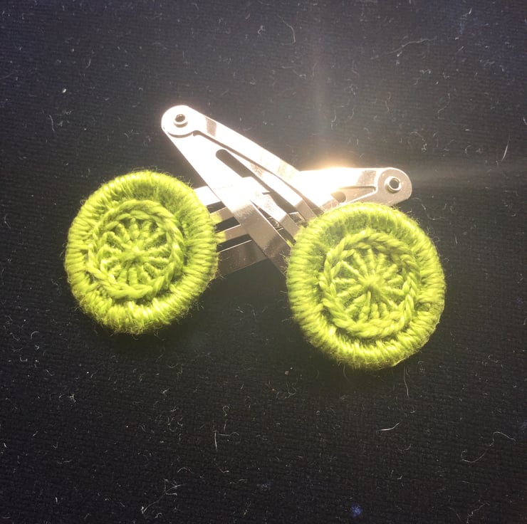 This pretty pair of Dorset button hair clips feature cross wheel buttons made with a bright green coloured cotton thread. The buttons are worked on a 25 mm brass ring and are fixed to the simple snap closing hair clip as part of the construction of the button and glued for added security.