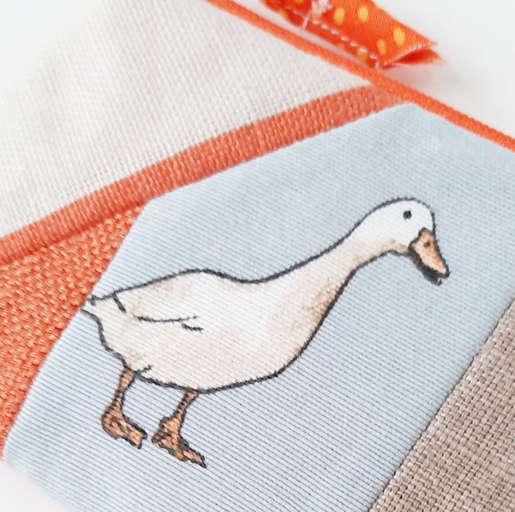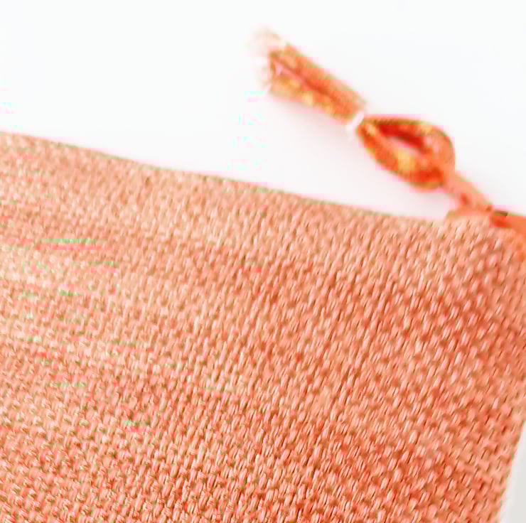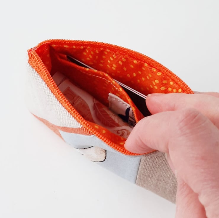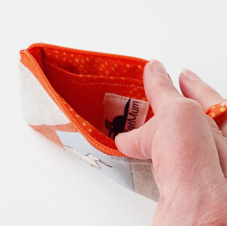 As soon as you open one of my purses you'll get a burst of colour! This one is orange, and there's and orange zip too! The zip even has a little tag made with the same orange fabric.