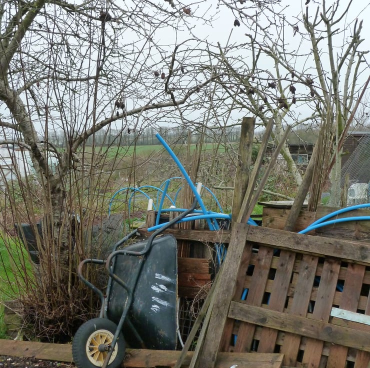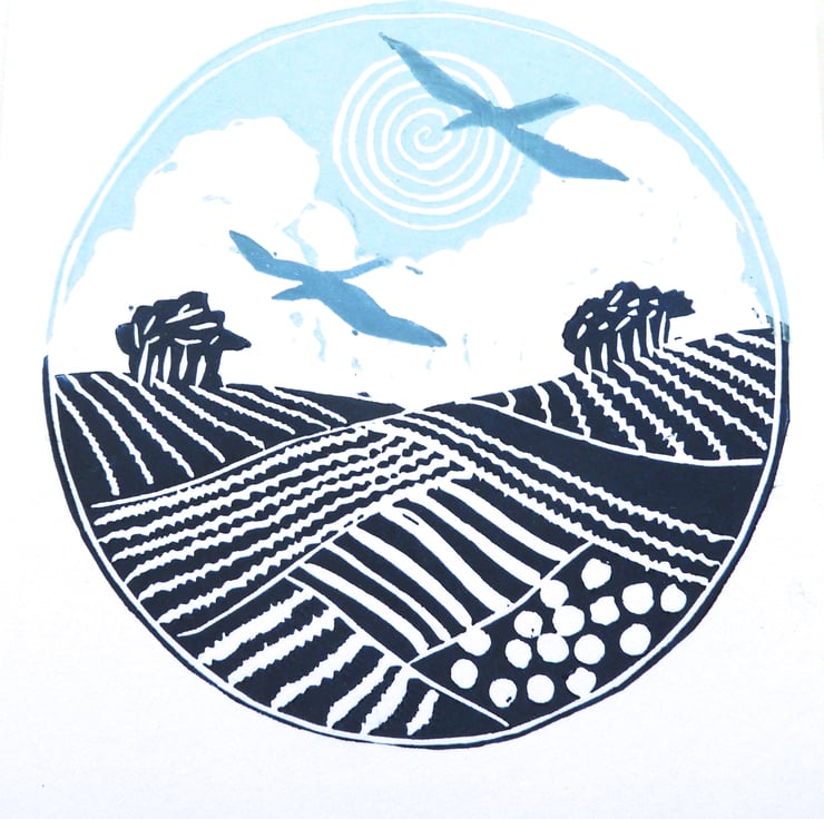 Beyond the rows of vegetables on my allotment, the view is of open fields with trees on the horizon. This is my happy place where I can sit and reflect, enjoying watching all the birds as they fly overhead or land in the plum tree. Some digging does take place too ! This view has inspired this little linocut card.