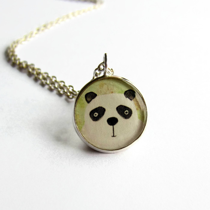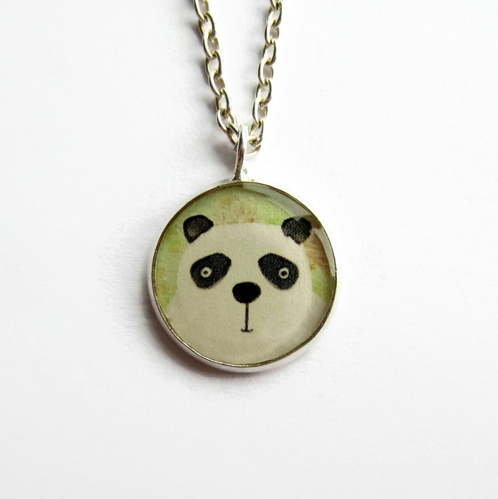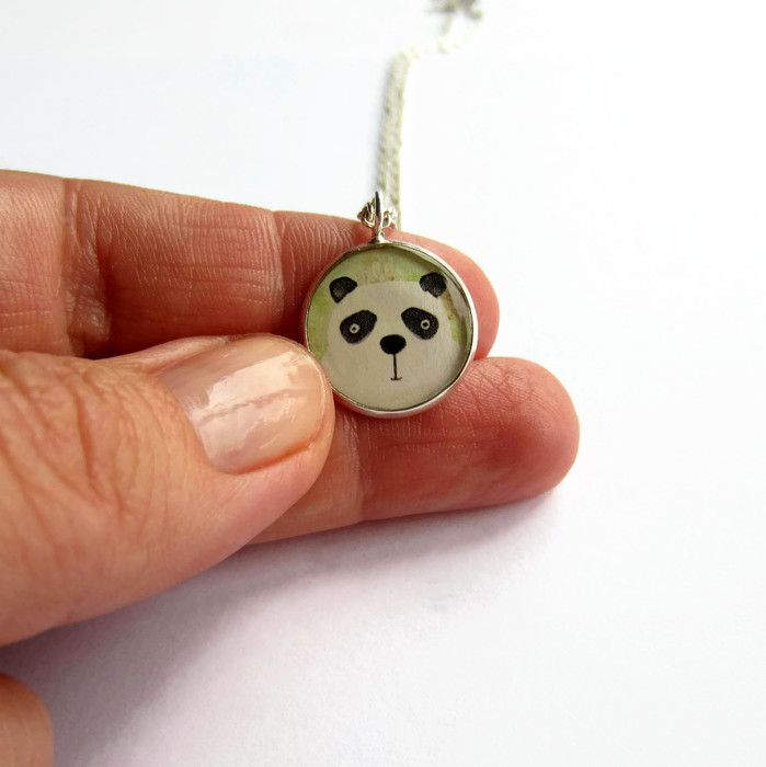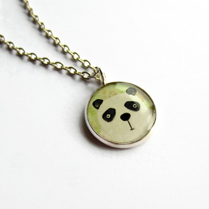 This sweet necklace features a watercolour picture of a little black and white panda set in a small circular resin pendant.