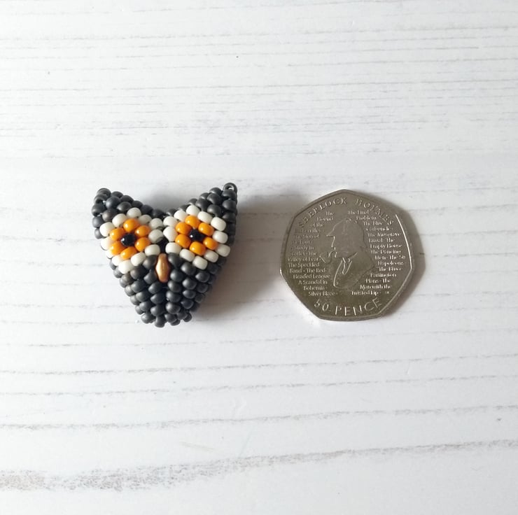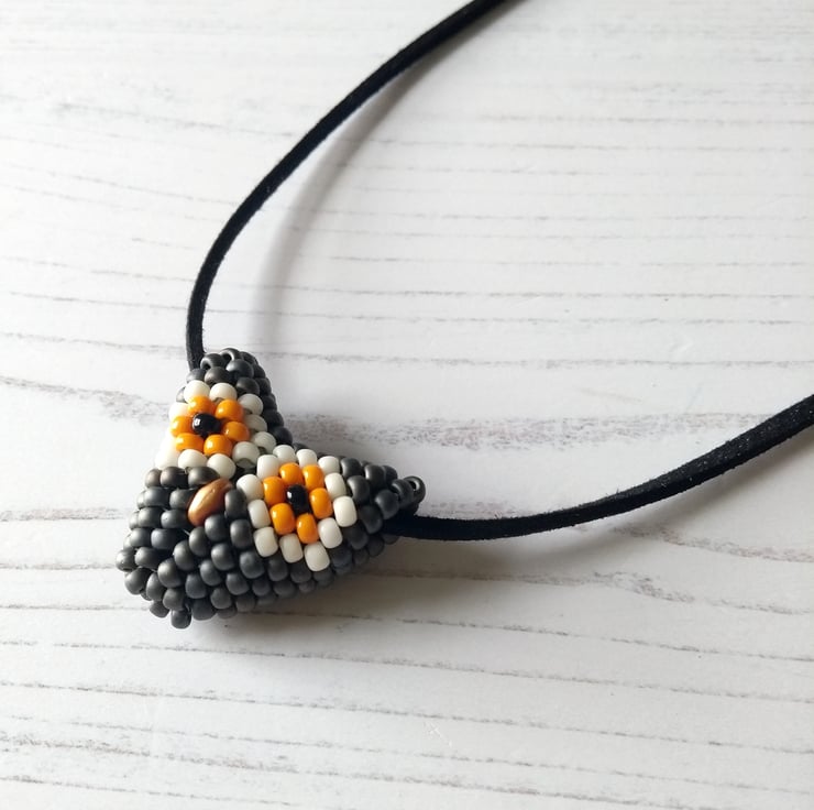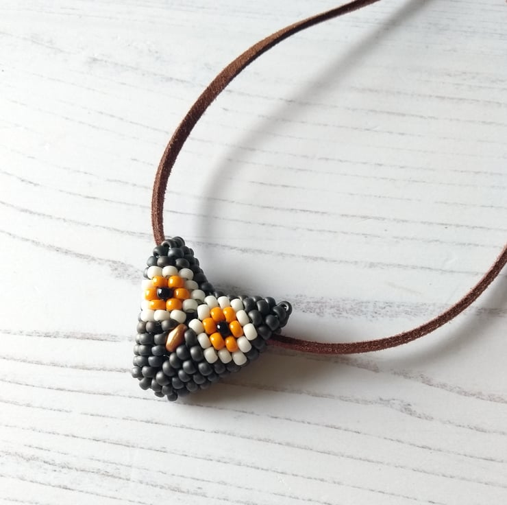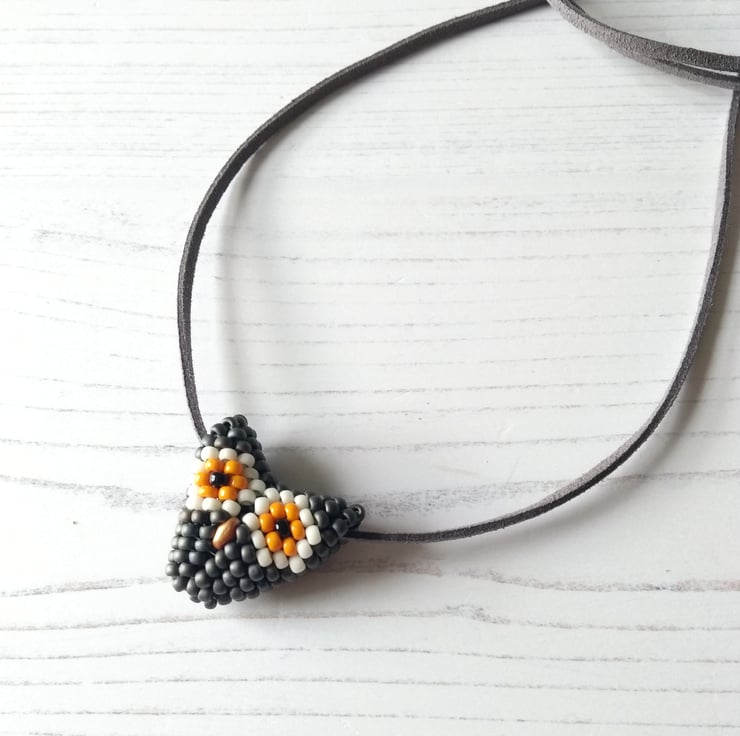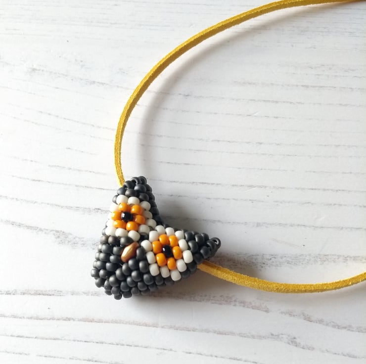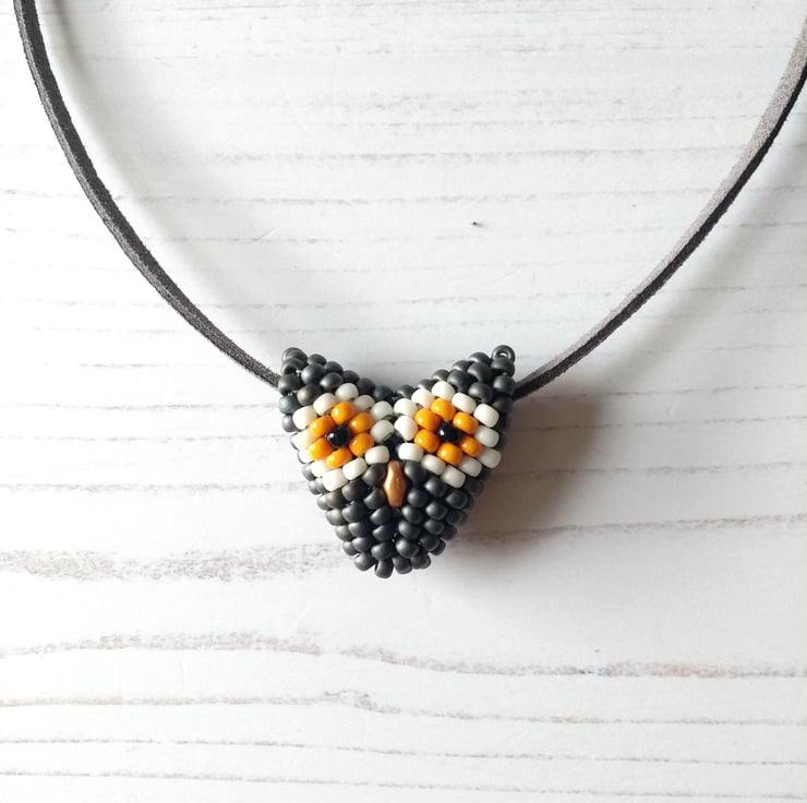 A new addition for 2021 was this vegan-friendly necklace featuring a super wise owl face. Hand-beaded with Japanese glass seed beads in metallic slate grey, orange and cream, together with two little black beads for eyes and even a little gold beak – this is the perfect accessory for any owl lover! Fox, badger and brown owl all available too.