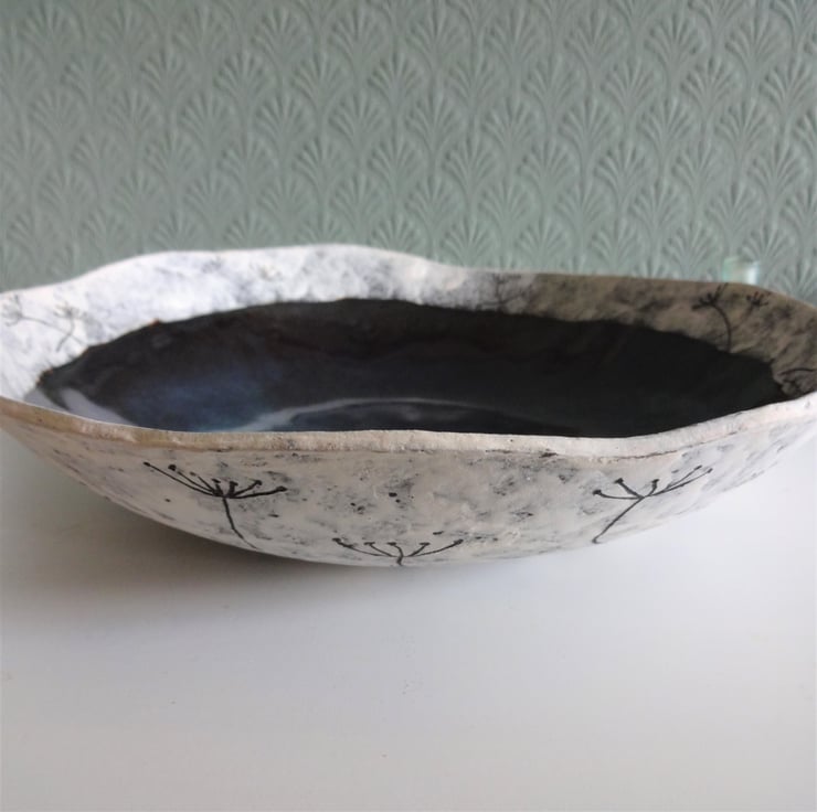 This one-off design bowl makes a lovely display piece for dried lavender, pot pourri, fruit, or your treasures from the natural world such as pebbles, shells and pine cones.The large bowl has a luscious dark blue/white speckled glazed interior and matt white dappled exterior decorated with incised seed head motifs. I formed the shape from black stoneware clay, creating a softly wavy asymmetric rim. On the outside the bowl has a matt finish which allows the black clay to peep through, and I incised a random pattern of seed heads, which I continued over the rim of the bowl. Inside I have used an iron lustre glaze which turns midnight blue with white speckles during the firing in my kiln. It’s large and shallow – 28cms diameter and about 4cms high. Underneath you’ll find my potter’s mark of a swallow in flight. It’s a decorative piece, so not suitable for cooking or serving foodstuffs.