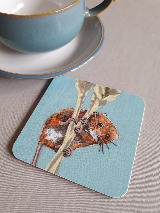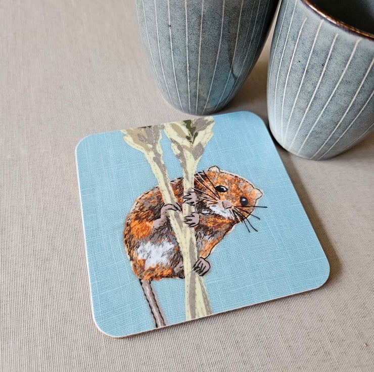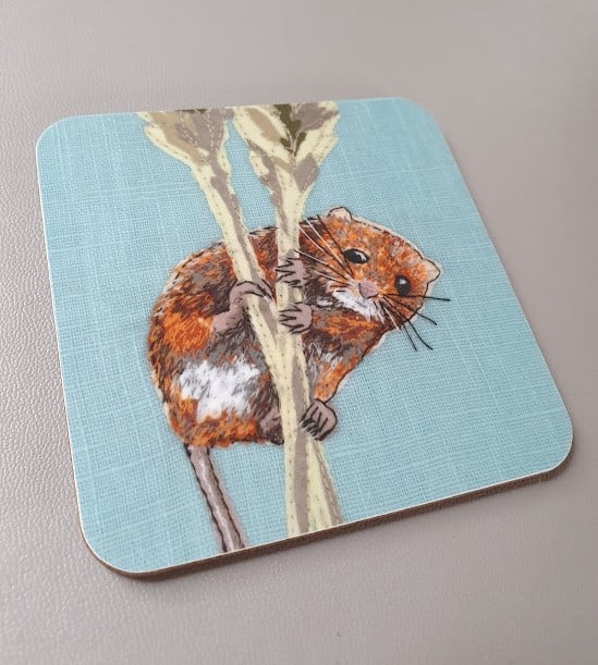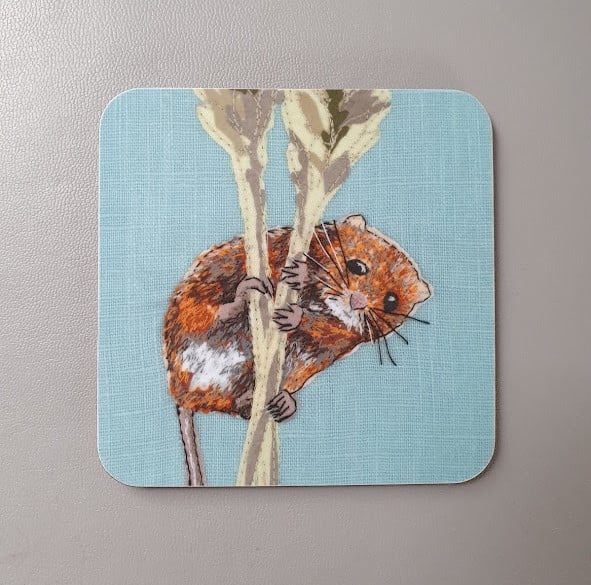 My designs are inspired by British wildlife. I create them using a combination of appliqué and freehand machine embroidery. The designs are then scanned and digitally printed on coasters and greetings cards, and are all listed on my Folksy shop.