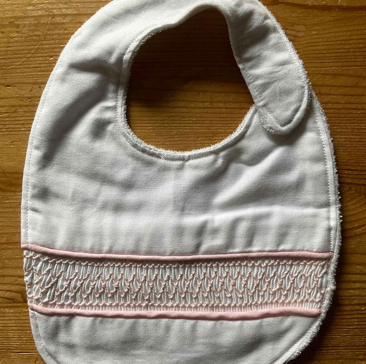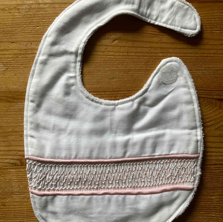 The bib top is an easy care poly-cotton and features an inserted panel of hand embroidered smocking worked in cotton thread which is edged with matching piping. The backing is towelling or brushed cotton for absorption. The bib fastens with Velcro spots for ease of use.
