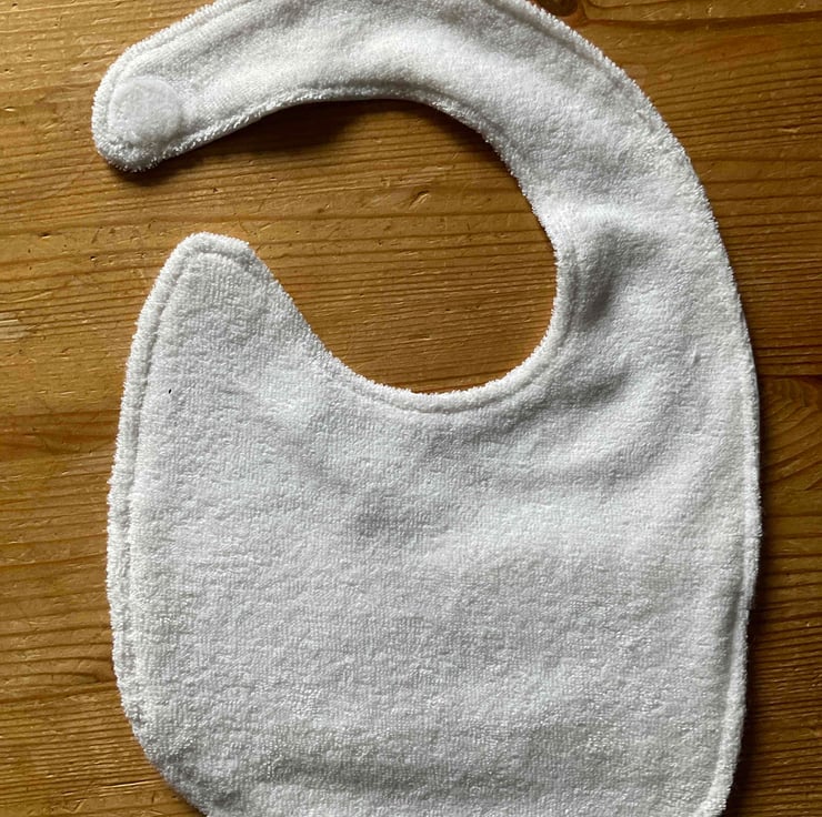 The bib measures 18 cm at the widest point and25 cm from back of neck to bottom.