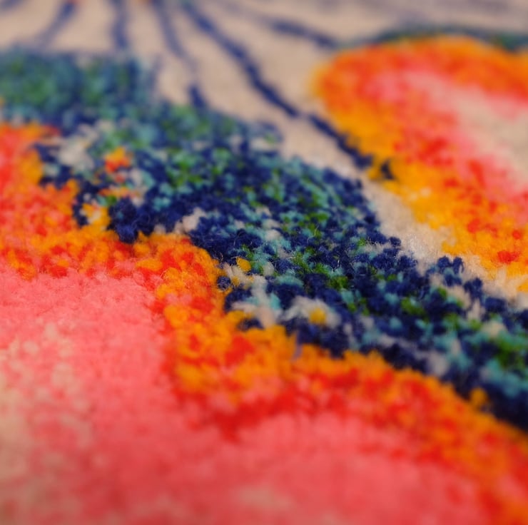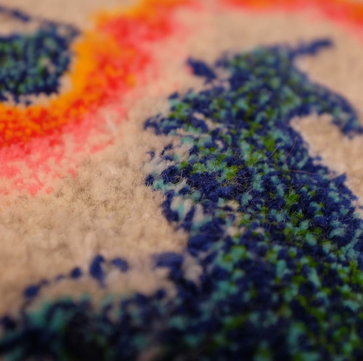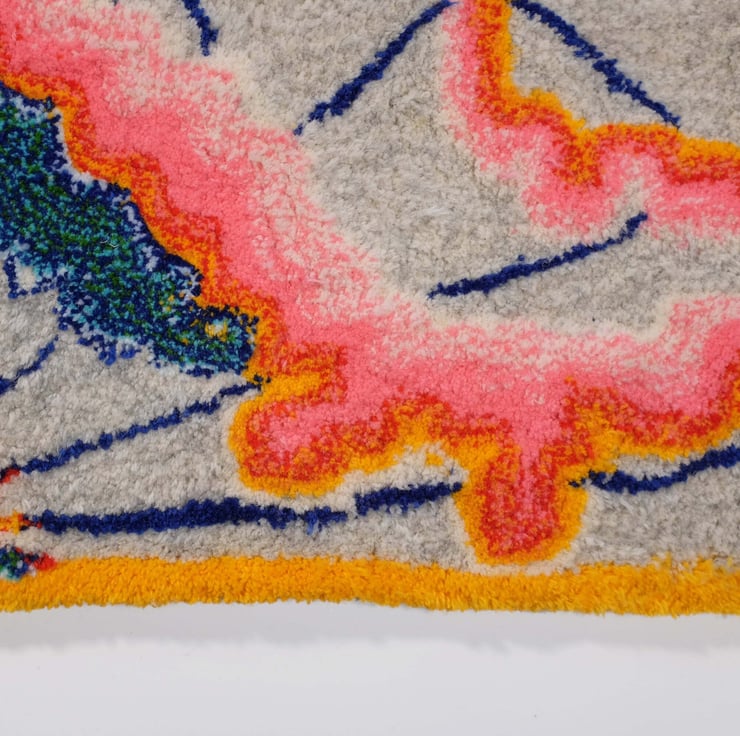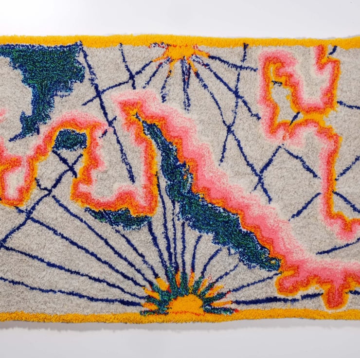 Navigation is a unique design created and hand-tufted by Christian Swallow. The design is inspired by ancient maps, which were often more works of art than functional documents. Their beauty gave the starting point to which were added vivid colours and sweeping lines.