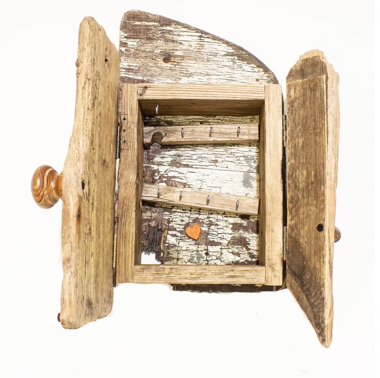 This whimsy reclaimed wood key box is handmade and unique, created of upcycled materials. It has been varnished with an indoor wood varnish, and it has 2 holes on the back side. It also has soft pads to keep your wall scratch-free. Beautiful colors and rustic details remind us of old, beaten, and rustic souls- but yet beautiful.