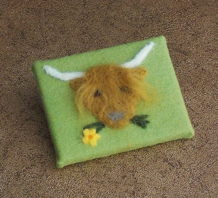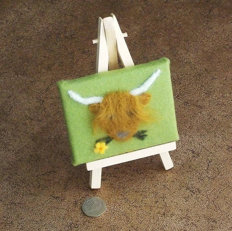 So adorable! This highland cow peers through a long shaggy fringe while munching on a flower. I have created this sweet little picture by needle-felting soft fluffy wool onto a wool felt background, then the whole has been mounted onto a tiny canvas for support. The mini easel is included.