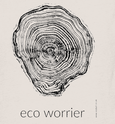 An original artist design from one of my CYRESS tree ring art prints in black ink and with humorous strapline 'ECO Worrier' (this design is also available on an Apron in Teal from my Folksy shop)