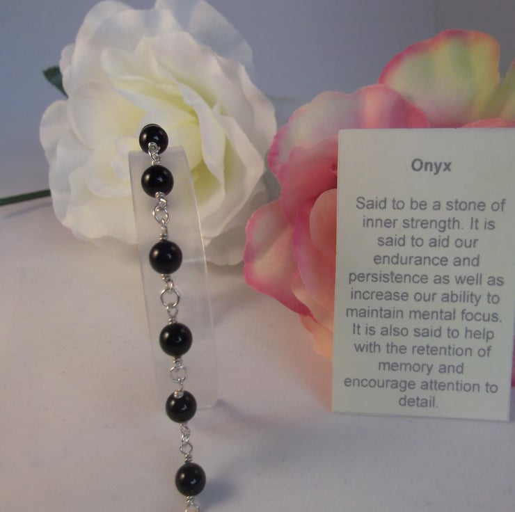 Onyx is said to be a stone of inner strength. It is said to aid our endurance and persistence as well as increase our ability to maintain mental focus. It is also said to help with the retention of memory and encourage attention to detail. It resonates most strongly with the Earth star chakra.