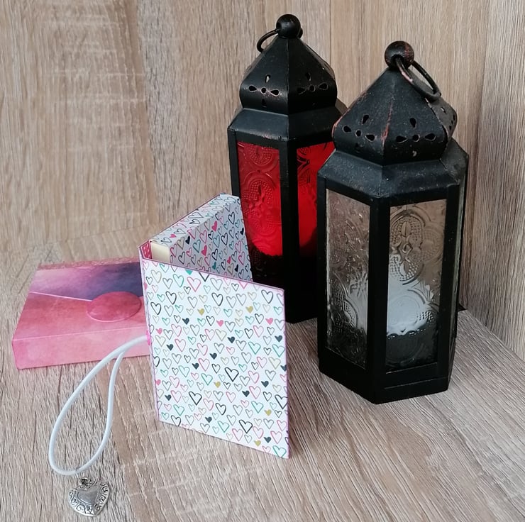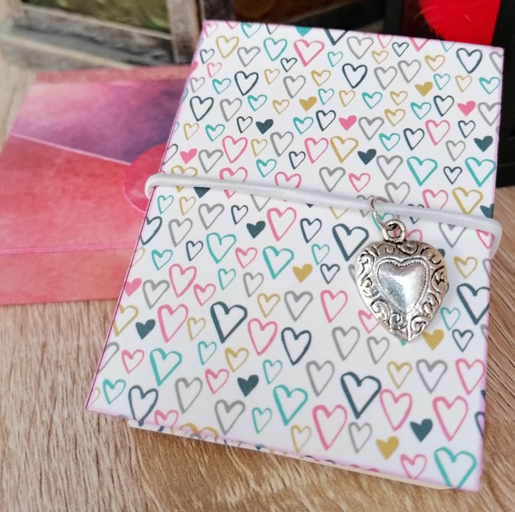 The cover is made from upcycled packaging covered in a pretty heart design paper. It is held closed with an elastic fastening embellished with a small heart charm.