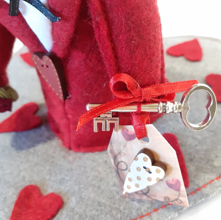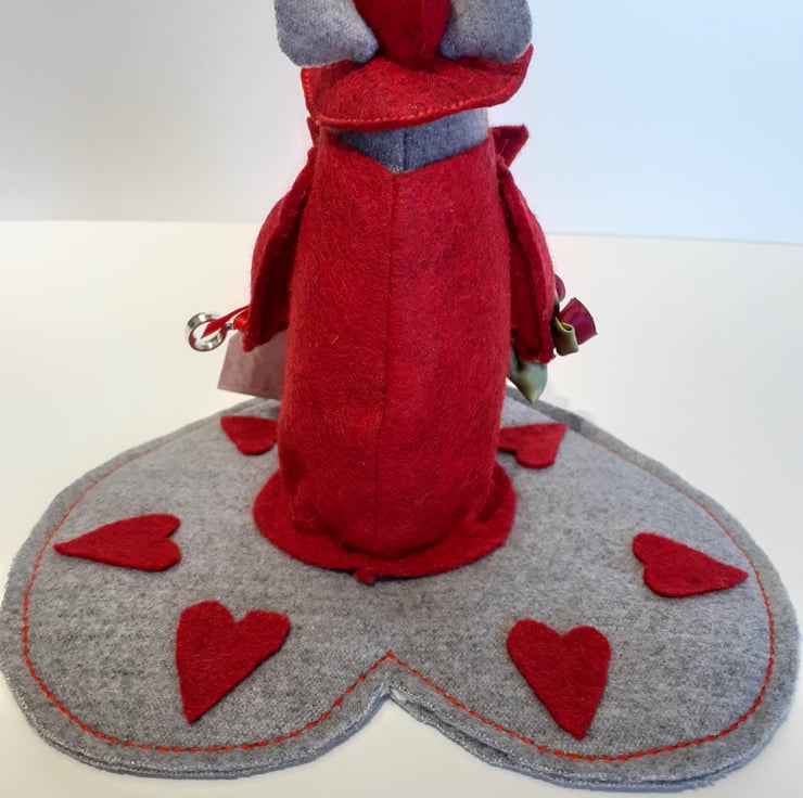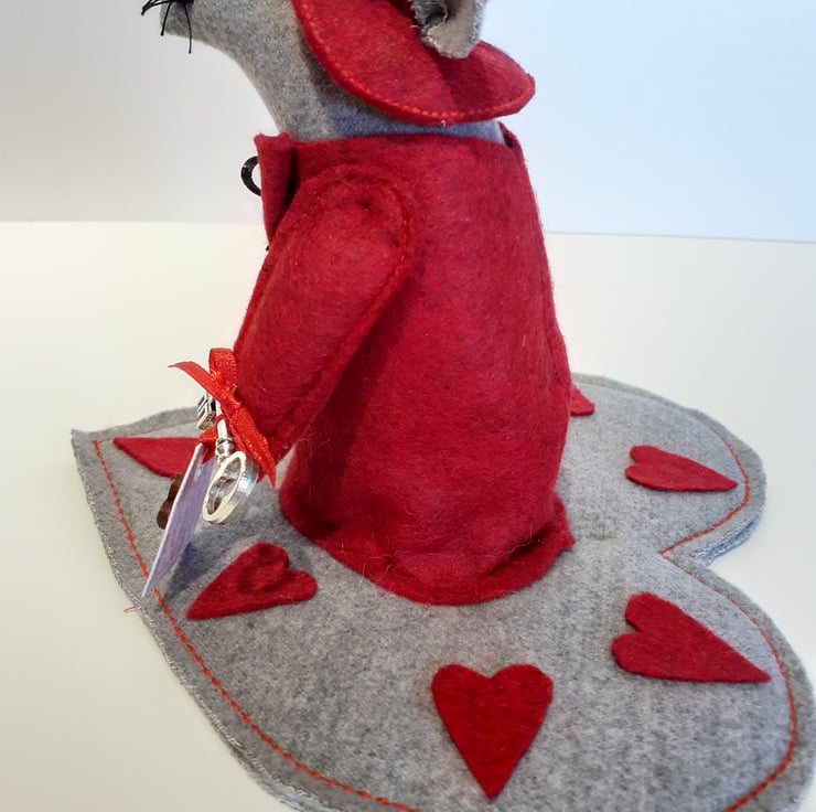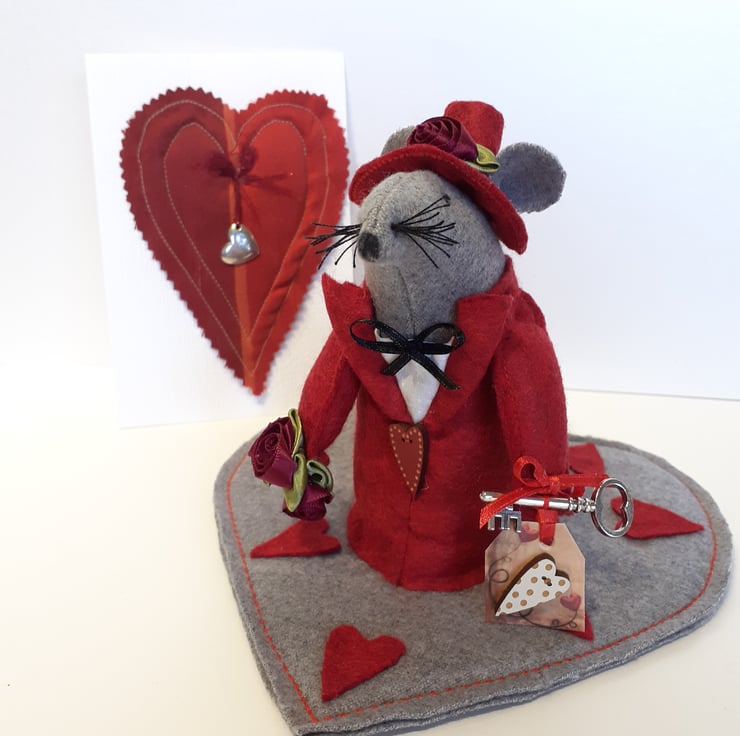 This super cute Valentine mouse dressed up in red felt holding roses and the key to your heart sitting on a grey felt heart mat is a very unique gift for the special person in your life.