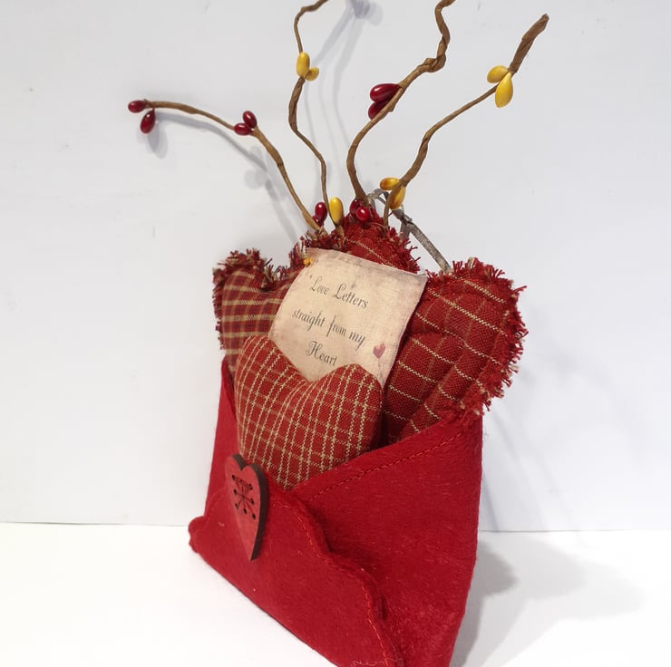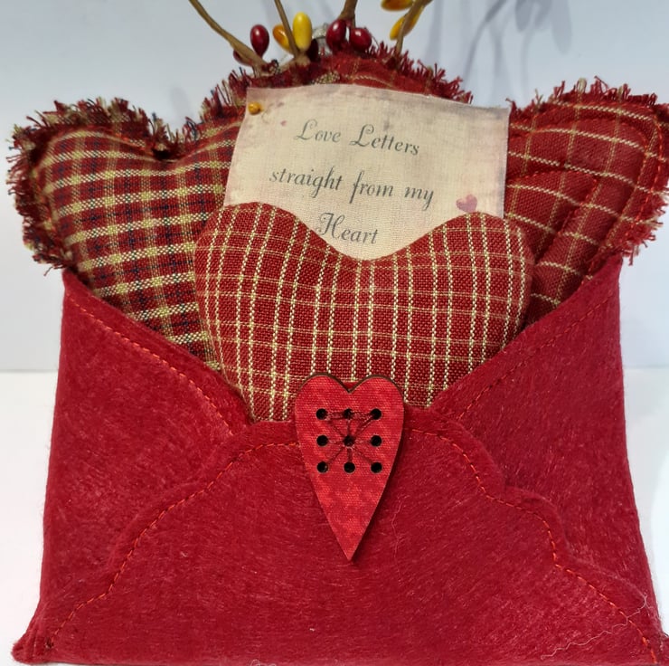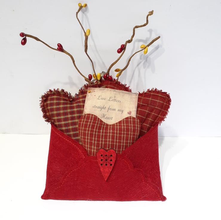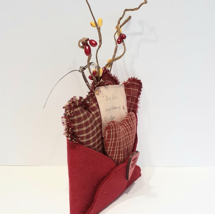 Three different patterned Homespun cotton hearts sitting inside a beautiful red wool felt envelope with a little sign 'Love letters straight from my heart' tucked inbetween the hearts. A very special Valentine gift. A love token for the very special person in your life. To finish this gift off, I added some pip berries.
