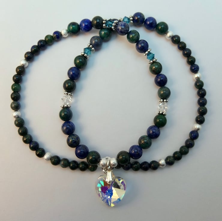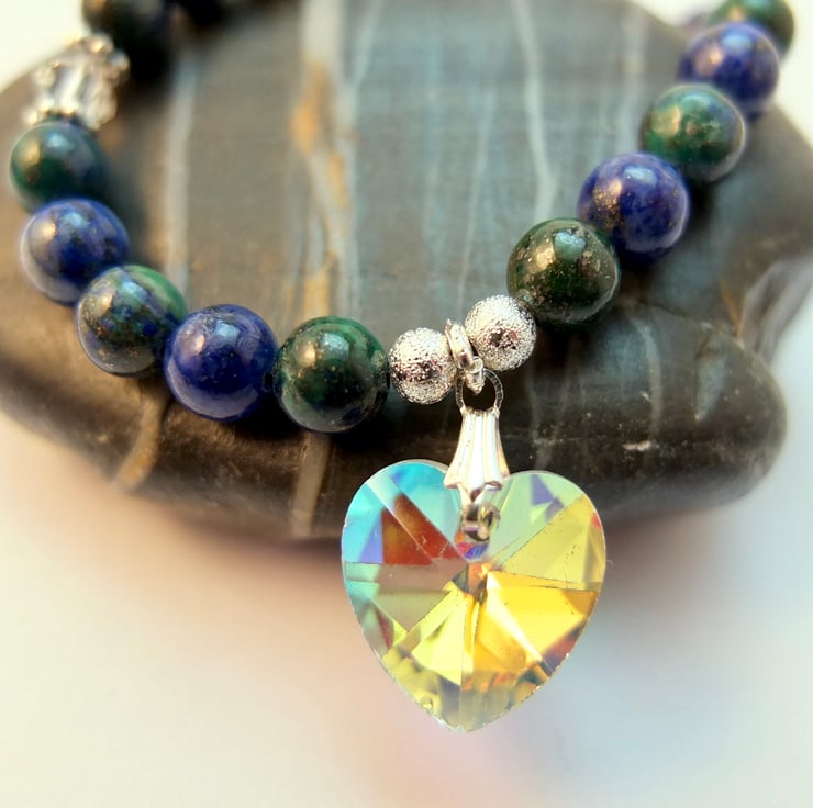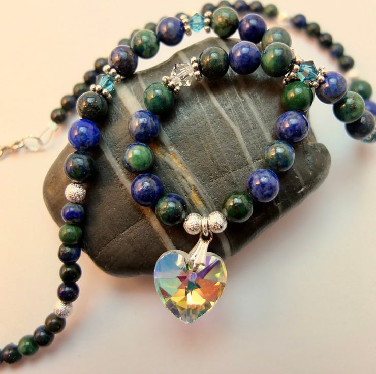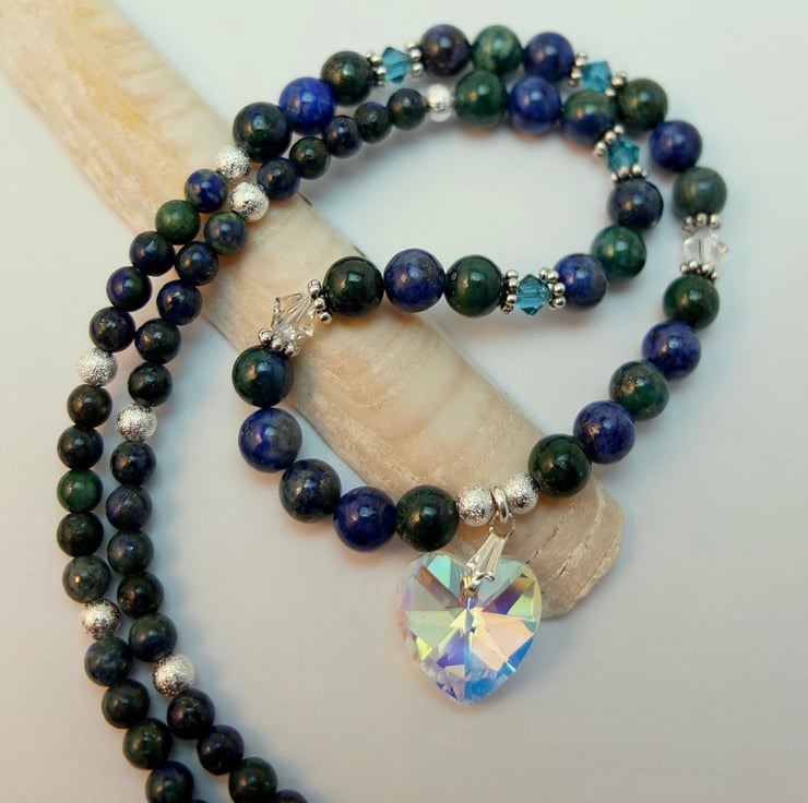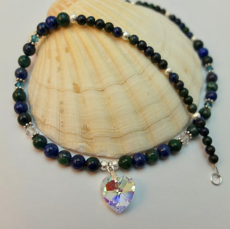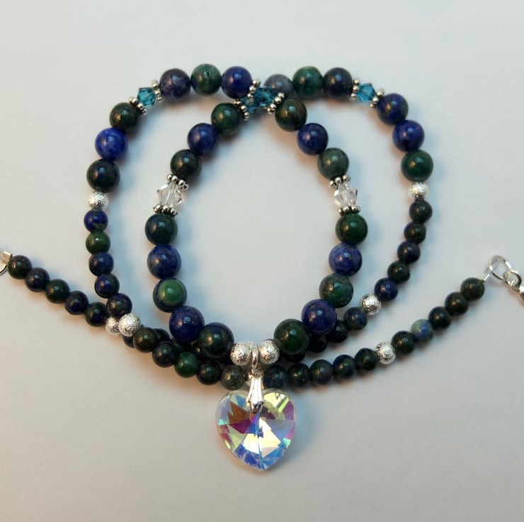 Pretty, sparkly necklace featuring a 16mm faceted crystal Czech glass heart set between 6mm and 4mm chrysocolla beads.