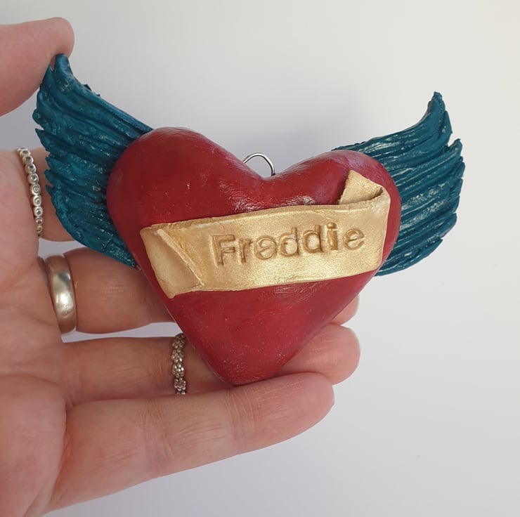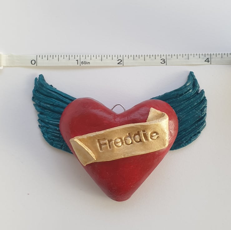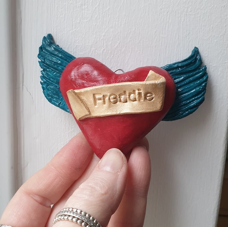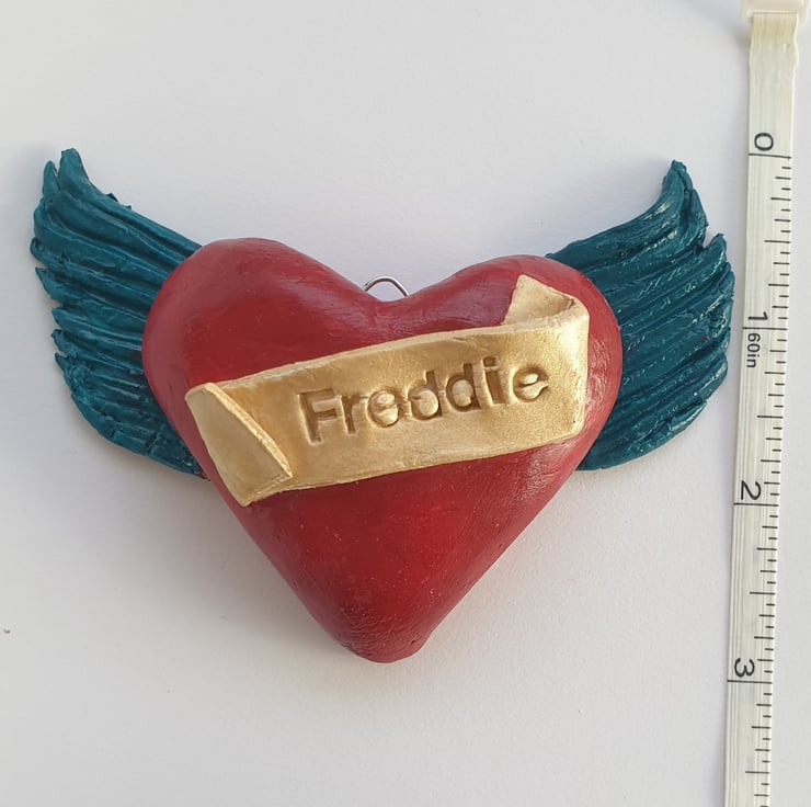 Rustic handmade Valentines heart with wings. Personalised. Made in Air dry clay and painted in acrylic paint and sealed with a glaze. has a metal hanging loop and comes with twine.