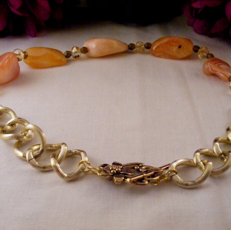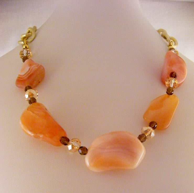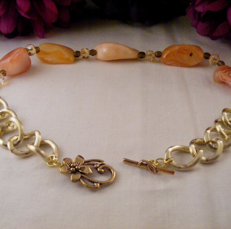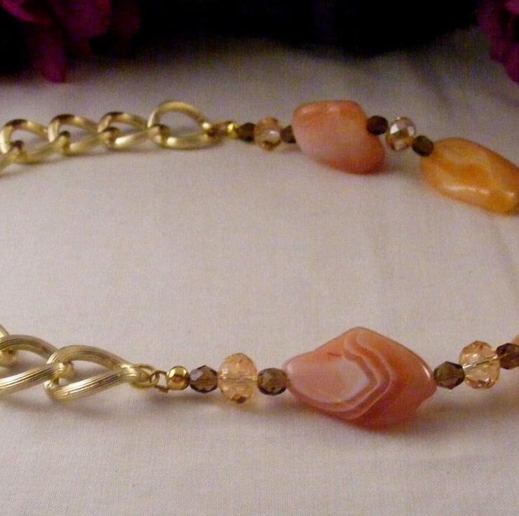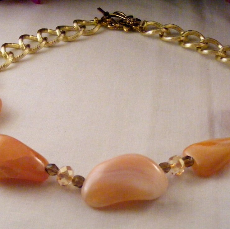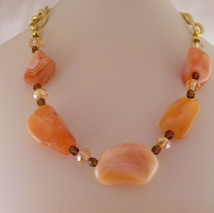 I've handmade this chunky gemstone necklace with, 25 mm, 30 mm and 40 mm peach botswana agate nuggets, 6 mm brown fire polish beads, 6 x 8 mm peach faceted crystal rondelles, Beading wire, gold plated findings, 20 x 18 mm gold plated chain and a toggle clasp.
