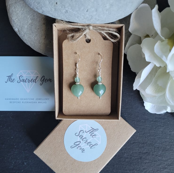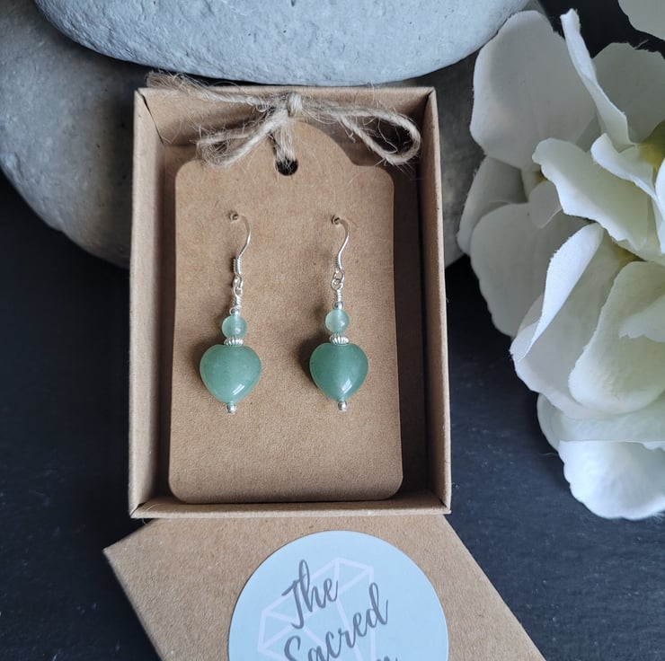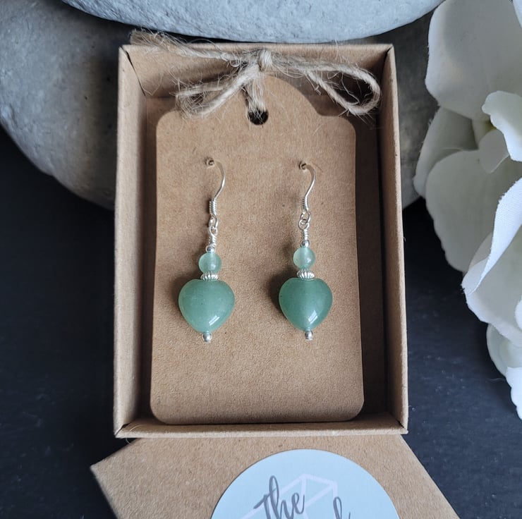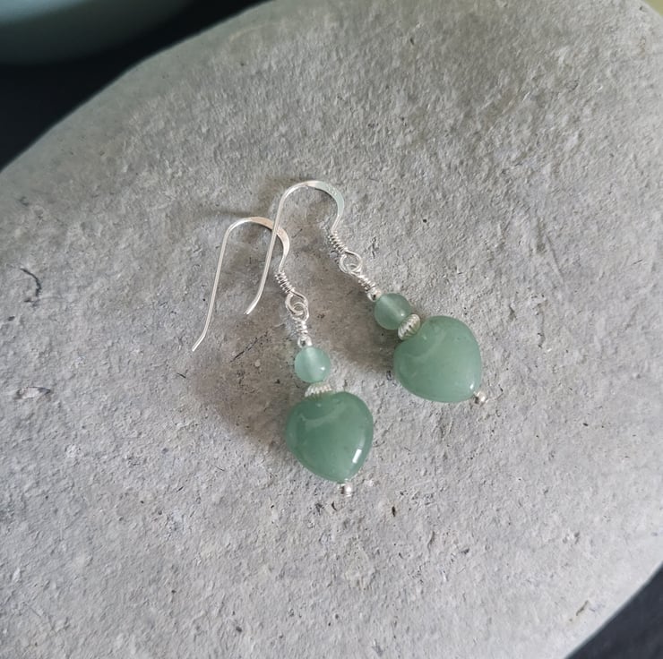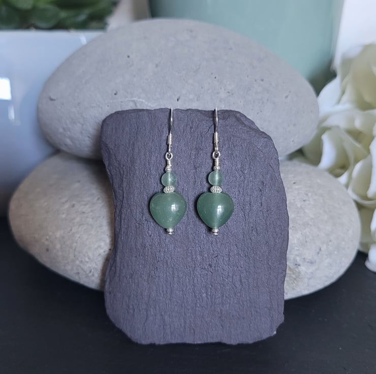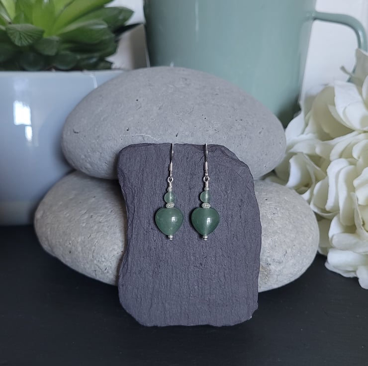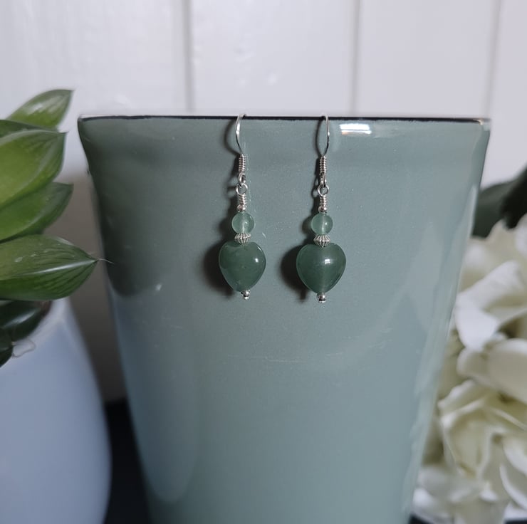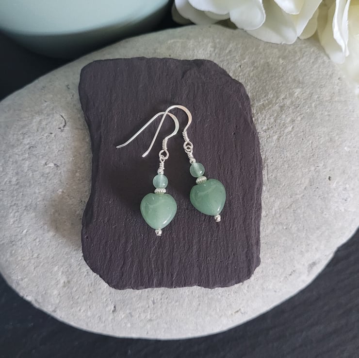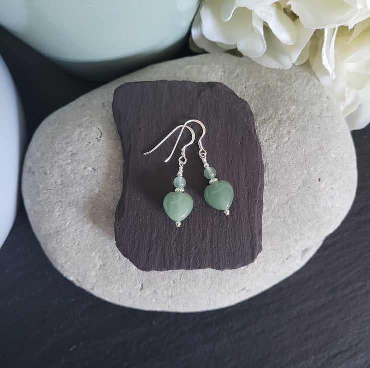 These pretty earrings feature a heart-shaped green aventurine gemstone. They are complimented with sterling silver beads and a small round green aventurine bead. All the metal components are sterling silver.