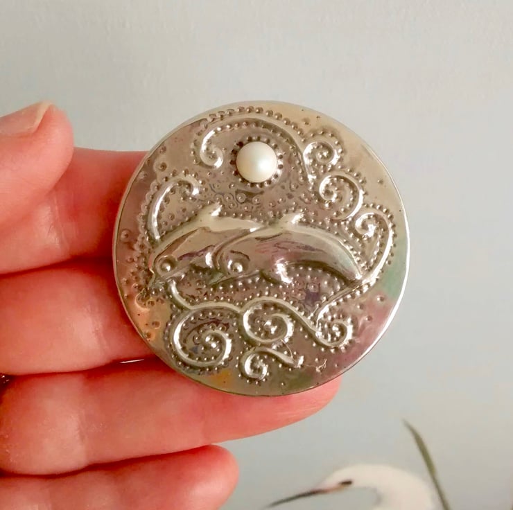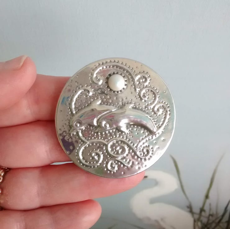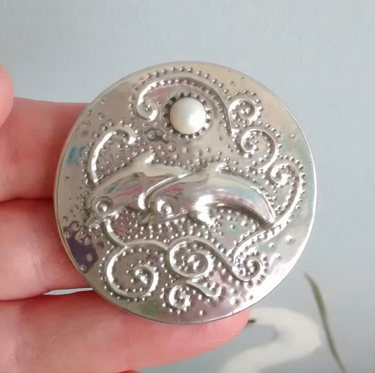 Handcrafted in shiny lead-free pewter, this beautiful sea-themed brooch is large but light in weight for versatility of wear. Add a touch of glittering silver to your outfit. Modern pewter does not tarnish, so no problem with keeping it bright. Measuring 45 mm across and set with a Swarovski glass pearl cabochon, this brooch would be a fabulous gift for a woman who loves wildlife and the ocean, with the additional bonus of knowing that the piece is unique. There is a 30mm pin with safety catch on the reverse.