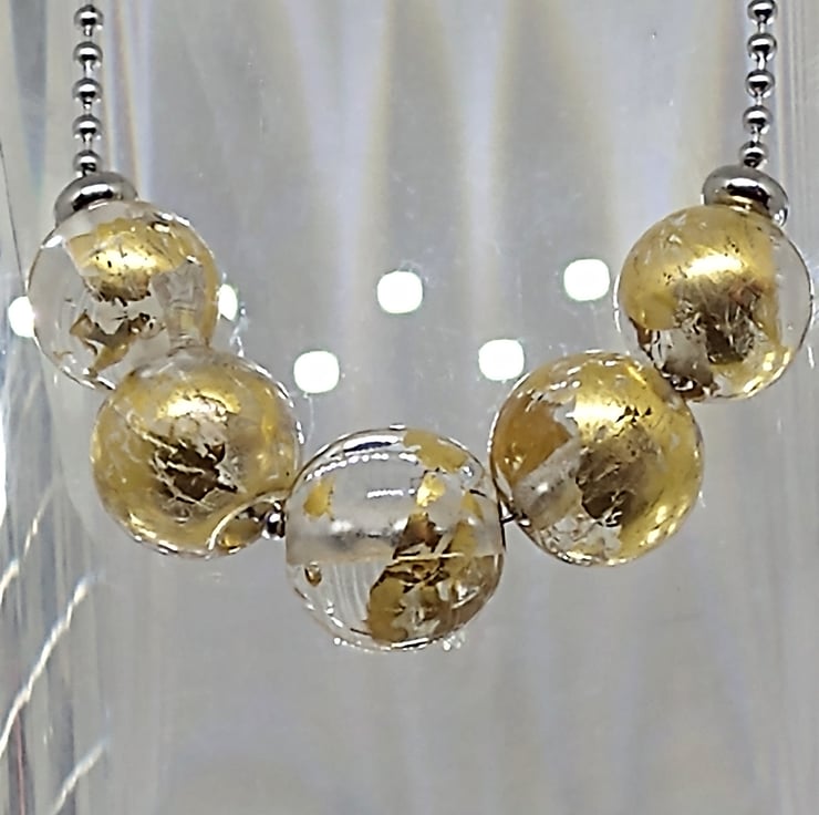 An elegant Orb bead necklace featuring a trio of clear hand crafted beads burnished with 23K gold leaf.