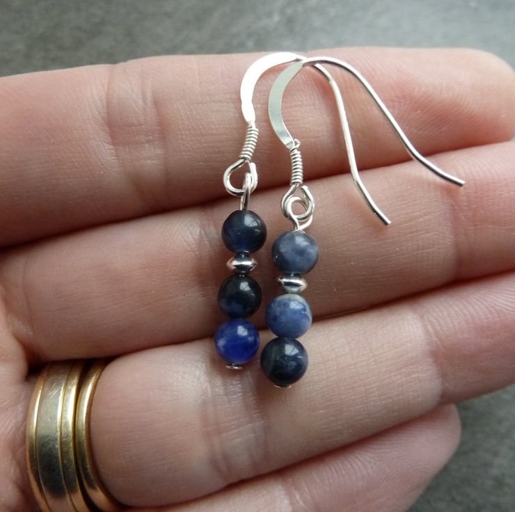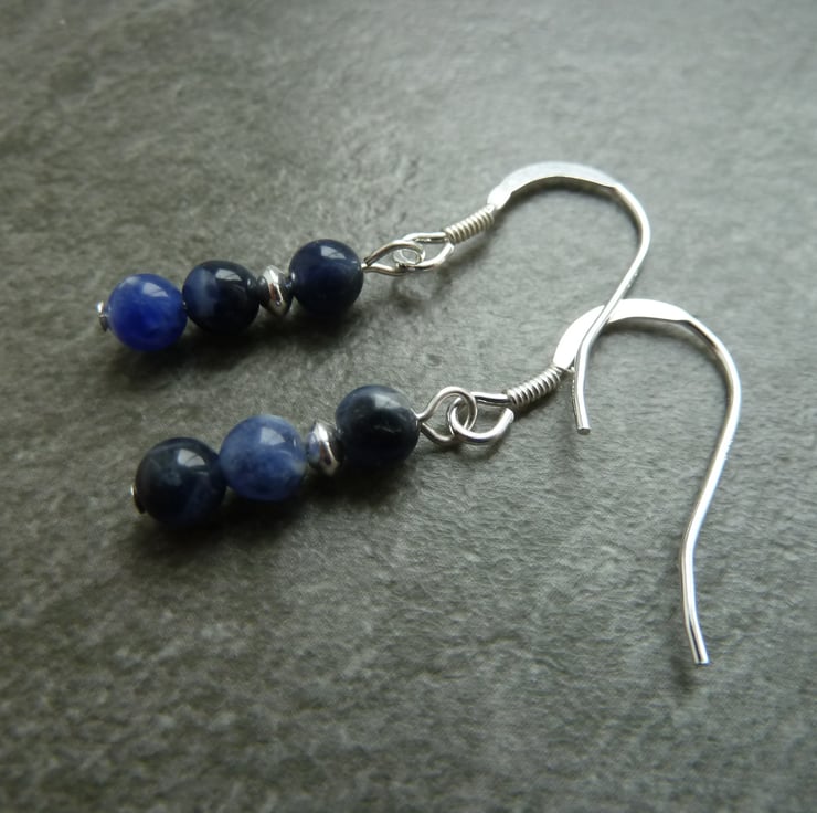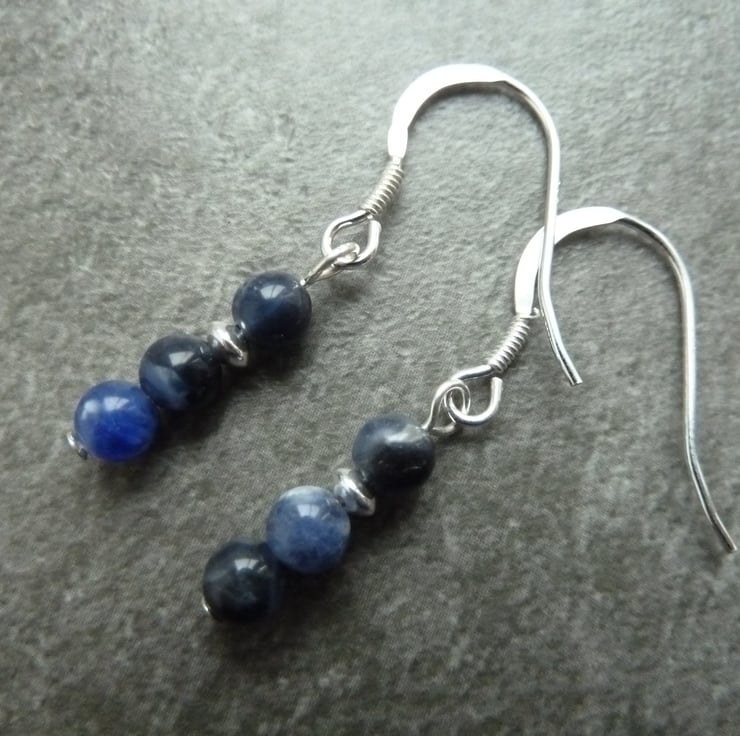 A pair of sterling silver earrings made with sodalite gemstone beads and sterling silver beads.