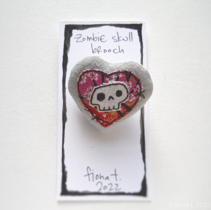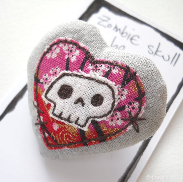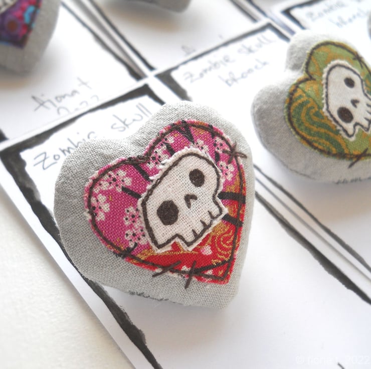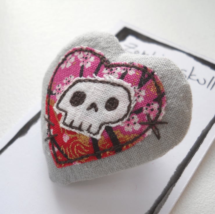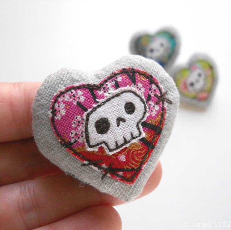 squishy skull heart fabric brooch or pin, measuring about 4cm.