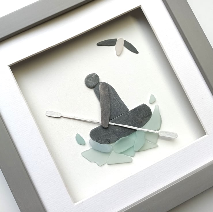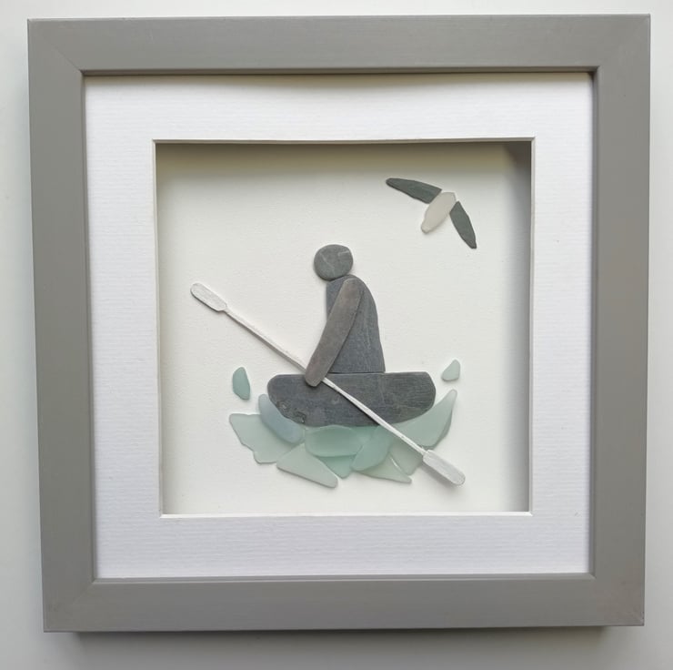 A little stone kayaker paddling on an ocean of palest blue Cornish sea glass set inside a 24cm square (15cm aperture) glass fronted box frame that is ready to hang on your wall.